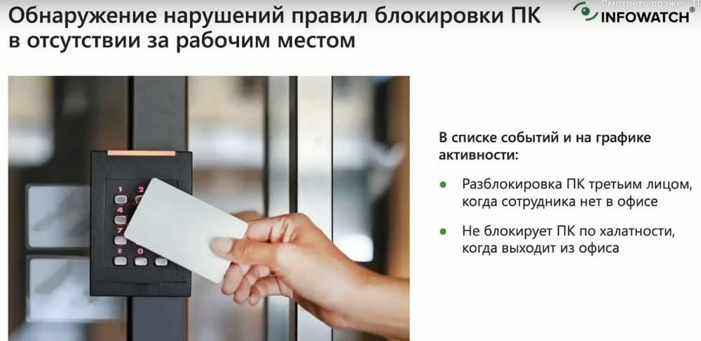 Получение данных из СКУД, эта функциональность также появилась в свежей версии InfoWatch Activity Monitor. Дело в том, что сотрудник прежде чем сесть за рабочий компьютер в офисе, либо после того, как он его выключает, он должен пройти через СКУД в офис, либо когда он выходит из офиса, СКУД фиксирует этот факт. Если разблокировка компьютера произошла и до этого не был зафиксирован факт входа сотрудника через СКУД, это может свидетельствовать от том, что разблокировка произведена третьим лицом, что является нарушением.