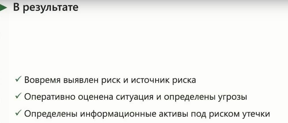 По результатам этой работы офицер довольно оперативно сначала выявил риск, понял что является его источником и оперативно оценил ситуацию, определил угрозы. Затем осуществляются превентивные меры, чтобы утечки не произошло.