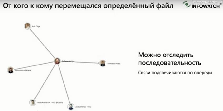 Какие здесь обновления вышли в InfoWatch Vision? Во-первых, граф связи стал информативнее, по нему можно отследить последовательность передачи документа от одного участника к другому.