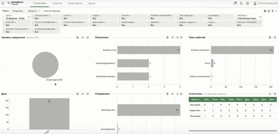 По данной персоне есть реальная угроза некоторой утечки информации, офицер проверяет были ли уже у этого сотрудника нарушения, зафиксированы ли они в DLP, он просматривает общую статистику по всем событиям DLP. Он видит, что за 20.02.2023 событий с нарушениями не было зафиксировано. Он проверяет какие права есть у данного сотрудника, для этого он переходит в модуль Data DISCAVERY.
