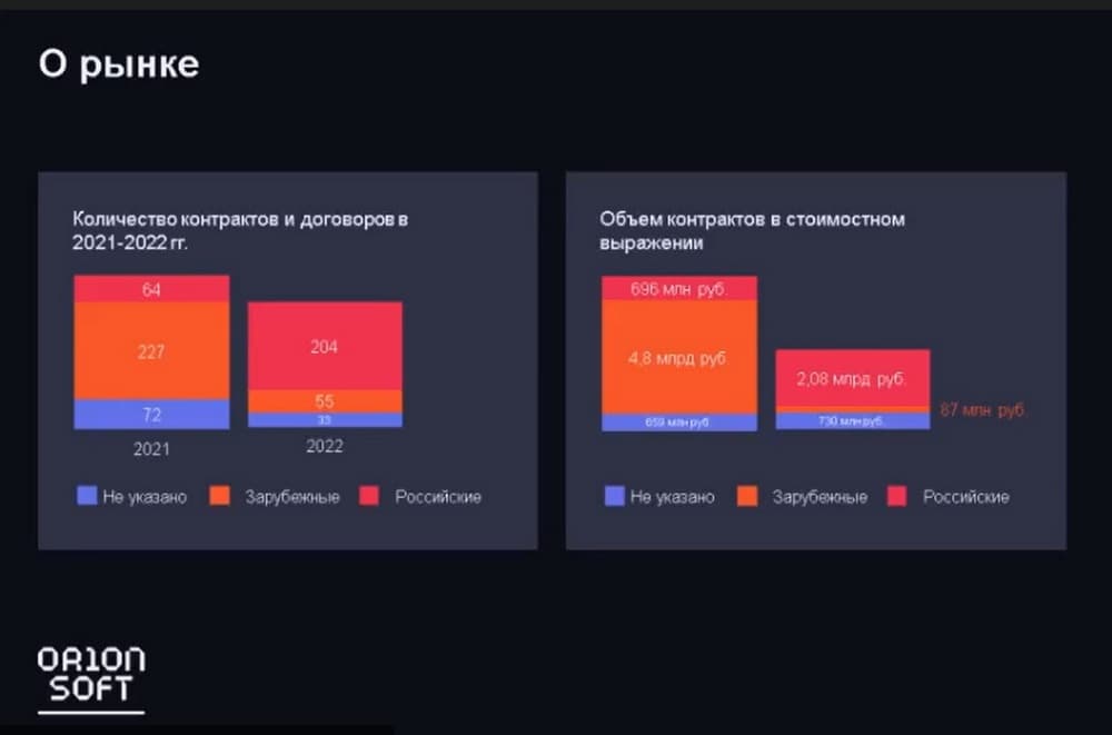 На этом слайде представлены интересные цифры. Порядка 75% заказчиков еще не перешли на российские решения по базам данных. Это данные от «Серчинформ» от ноября 2022 года значит они весьма актуальные. Объем контрактов в стоимостном выражении представлены на следующем слайде.