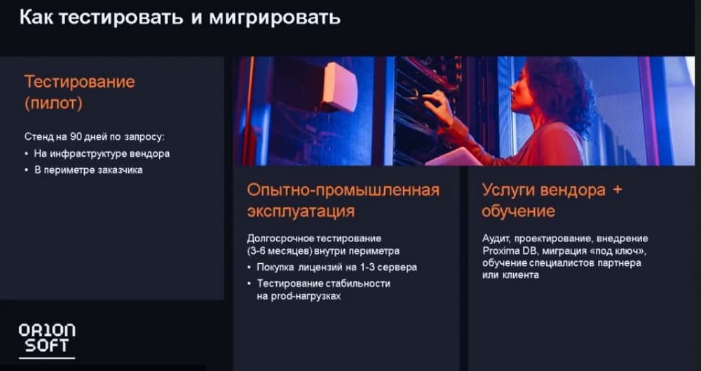 У нас есть большое количество демонстрационных ресурсов, можно подключиться к нам и самим посмотреть как работают наши базы данных, но можно привести заказчика к нам и мы своими силами продемонстрируем весь функционал, начиная от инсталляции и заканчивая основными операциями баз данных. Можно организовать стенд на 90 дней по запросу, можем также выдать лицензию, которую можно будет инсталлировать в периметре заказчика, здесь никаких проблем не будет. Есть история с опытно-промышленной эксплуатацией. Здесь можно организовать долгосрочное тестирование (3 – 6 месяцев также на инфраструктуре заказчика). Можно купить лицензии на 1-3 сервера и осуществить тестирование стабильности на prod-нагрузках.