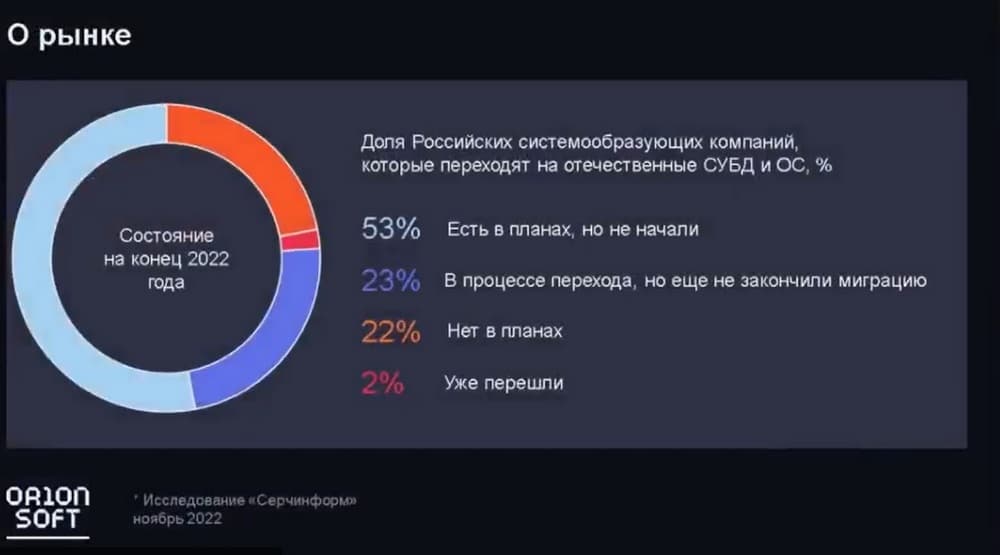 Здесь наблюдается почти трехкратный рост российских продаж СУБД 2022 года по отношению к 2021 году. Еще огромное количество проектов, заказчиков и денег, которые можно заработать нашим партнерам.