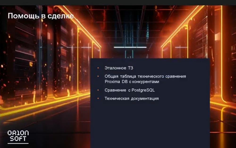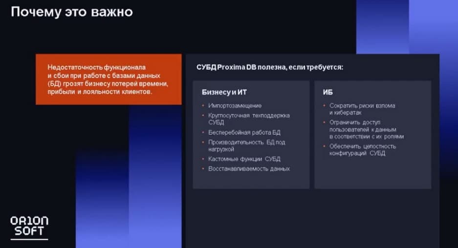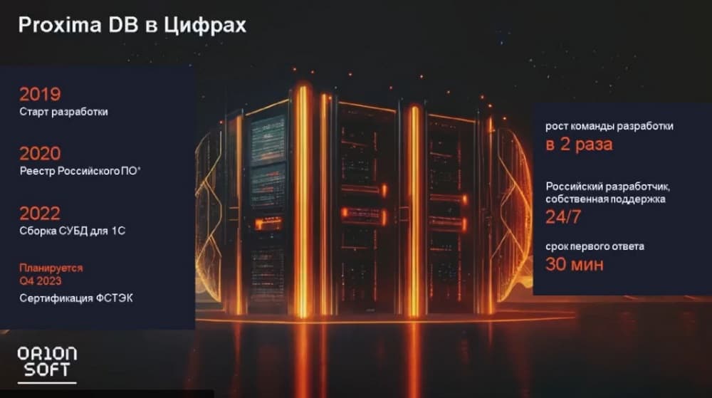 В 2020 году этот программный продукт был внесен в реестр российского программного обеспечения. В 2022 году рынок баз данных сильно вырос, кроме того «Орион софт» сделал сборку СУБД для компании «1С». Планируется в 4-м квартале 2023 года пройти сертификацию ФСТЭК. За последний год команда разработки базы данных была увеличена практически в два раза. Тем не менее, мы, как и прежде осуществляем техническую поддержку 24/7 и реакцию в 30 минут.