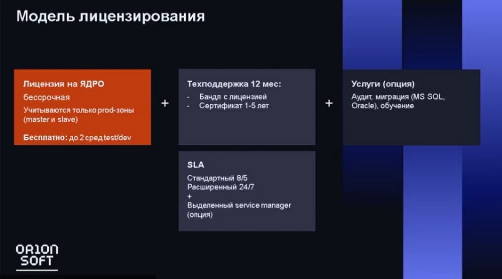 Базовая инсталляция – это две лицензии, у нас лицензируются master и slave. Сама лицензия на ядро является бессрочной и далее идет просто приобретение техподдержки. Можно приобрести бандл, где будет лицензия и техническая поддержка на срок от года до пяти лет, либо можно все это приобрести отдельно. Можно дополнительно приобрести услуги (опции): аудит, миграцию (MS SQL, Oracle) и обучение. Сейчас мы работает над подготовкой обучения сейлов, это обучение пока проходит в тестовом режиме.
