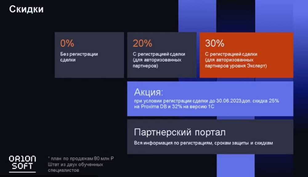 Что касается коммерческого блока, то самое важное то, что в рамках нашей партнерской программы наши партнеры получают 20% скидки на наши продукты, если они авторизованы (с регистрацией сделки). А как только наши взаимоотношения по объемам переходят границу в 80 миллионов рублей в рамках года и выше, партнер становится экспертным партнером и получает скидку уже в 30% (с регистрацией сделки) на все продукты компании «Орион софт».