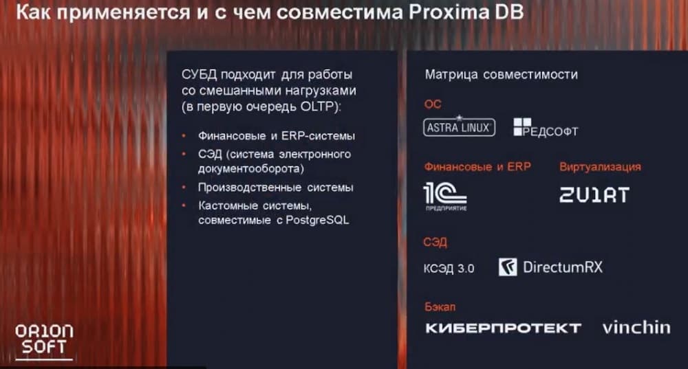 Как применяется и с чем совместима Proxima DB? Эта СУБД подходит для работы со смешанными нагрузками (в первую очередь OLTP): финансовые и ERP-системы, системы электронного документооборота, производственные системы, кастомные системы, совместимые с PostgreSQL. Что касается матрицы совместимости, то это операционные системы ASTRA LINUX и РЕДСОФТ, в ближайшее время сюда добавится и БАЗАЛЬТ. Что касается финансовых и ERP-систем, то это «1С», что касается СЭД, то здесь КСЭД 3.0 и DirectumRX, что касается бэкапа, то это КИБЕПРОЕКТ и Vinchin (продукт из Поднебесной), который тоже теперь повсеместно используется. Со всеми этими продуктами подтверждена полная совместимость.