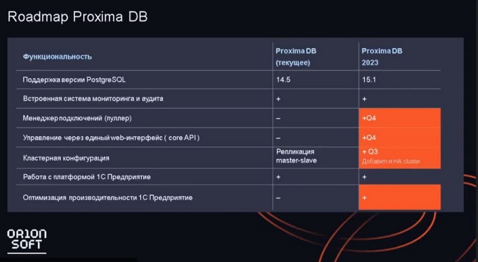 Официальная совместимость с «1С» - является важным этапом развития Proxima DB. Отказоустойчивость (НА Cluster) – запланирована на третий квартал 2023 года. У нас есть техническая поддержка 9/5, но мы рекомендуем все же использовать особенно в первый год эксплуатации режим поддержки 24/7 с временем реакции 30 минут.