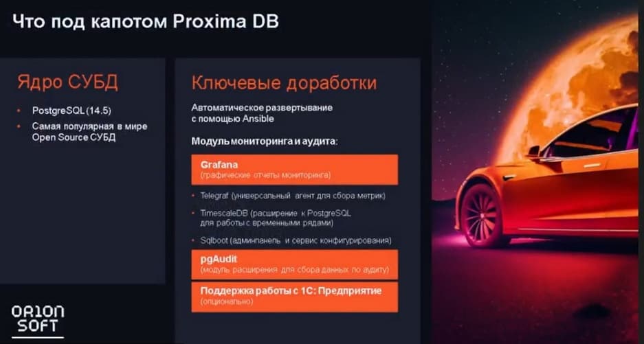 Под капотом у Proxima DB ядро СУБД PostgreSQL версии 14.5, при этом разработчиками не делалось глобальных доработок в ядре. Доработки заключались только в автоматизации развертывания с помощью Ansible и создании большого количества модулей по мониторингу и аудиту – Grafana, pgAudit, Telegraf и др.