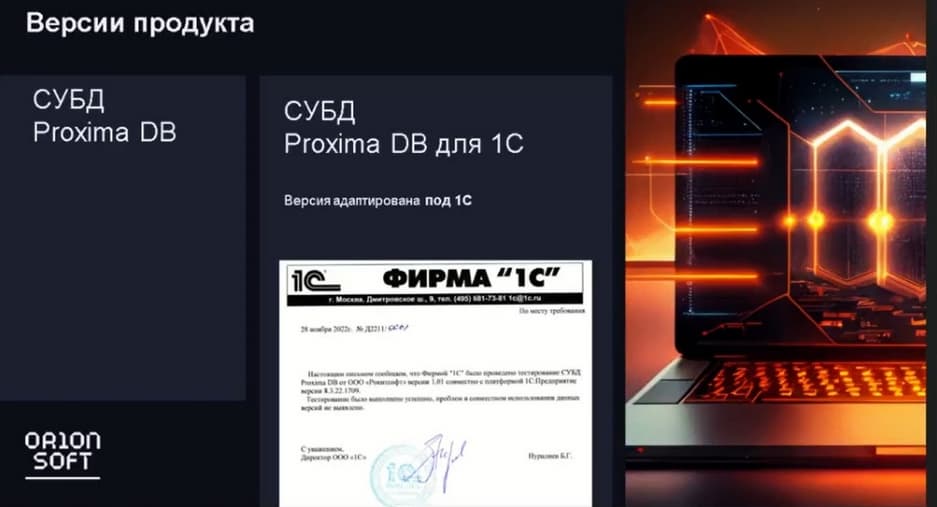 Кто клиент компании «Орион софт»? Видимо, любой корпоративный заказчик, любой кто использовал MS SQL и Oracle. Что касается версионности, пока разработчики компании «Орион софт» не стали делать большое число версий продукта Proxima DB. Сейчас есть две редакции, это собственно базовая Proxima и Proxima с доработками для компании «1С», этот вендор отметил что тестирование подтвердило работу базы данных с продуктами «1С».