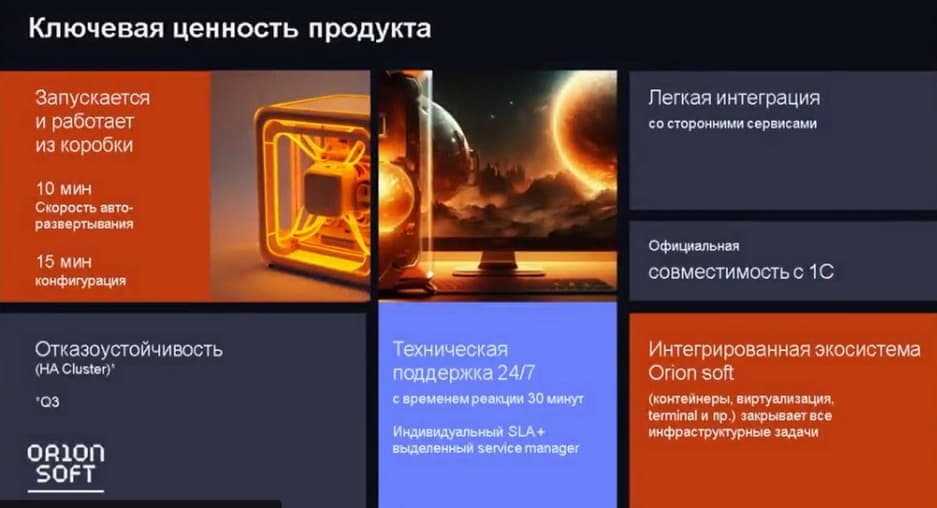 Если говорить о сравнении с российским лидером по виртуализации, то весь перечисленный здесь функционал и присутствие в российском реестре ПО, тем не менее лидера по функционалу мы либо уже закрываем, либо будем закрывать в ближайшее время. Кроме того, у нас есть ряд собственных разработок и техническая поддержка 24/7 с реакцией в 30 минут, пока такого нет ни у одного российского вендора.