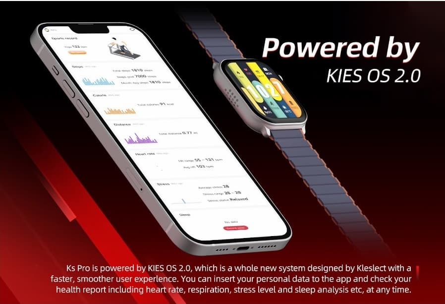 KIESLECT Ks Pro оснащен инновационной ОС KIES 2.0, которая обеспечивает более быстрый и плавный пользовательский интерфейс. Операционная система легко интегрируется с приложением, позволяя пользователям вводить личные данные и получать доступ к жизненно важной медицинской информации, такой как частота сердечных сокращений, дыхание, уровень стресса и результаты анализа сна. Следите за состоянием своего здоровья.