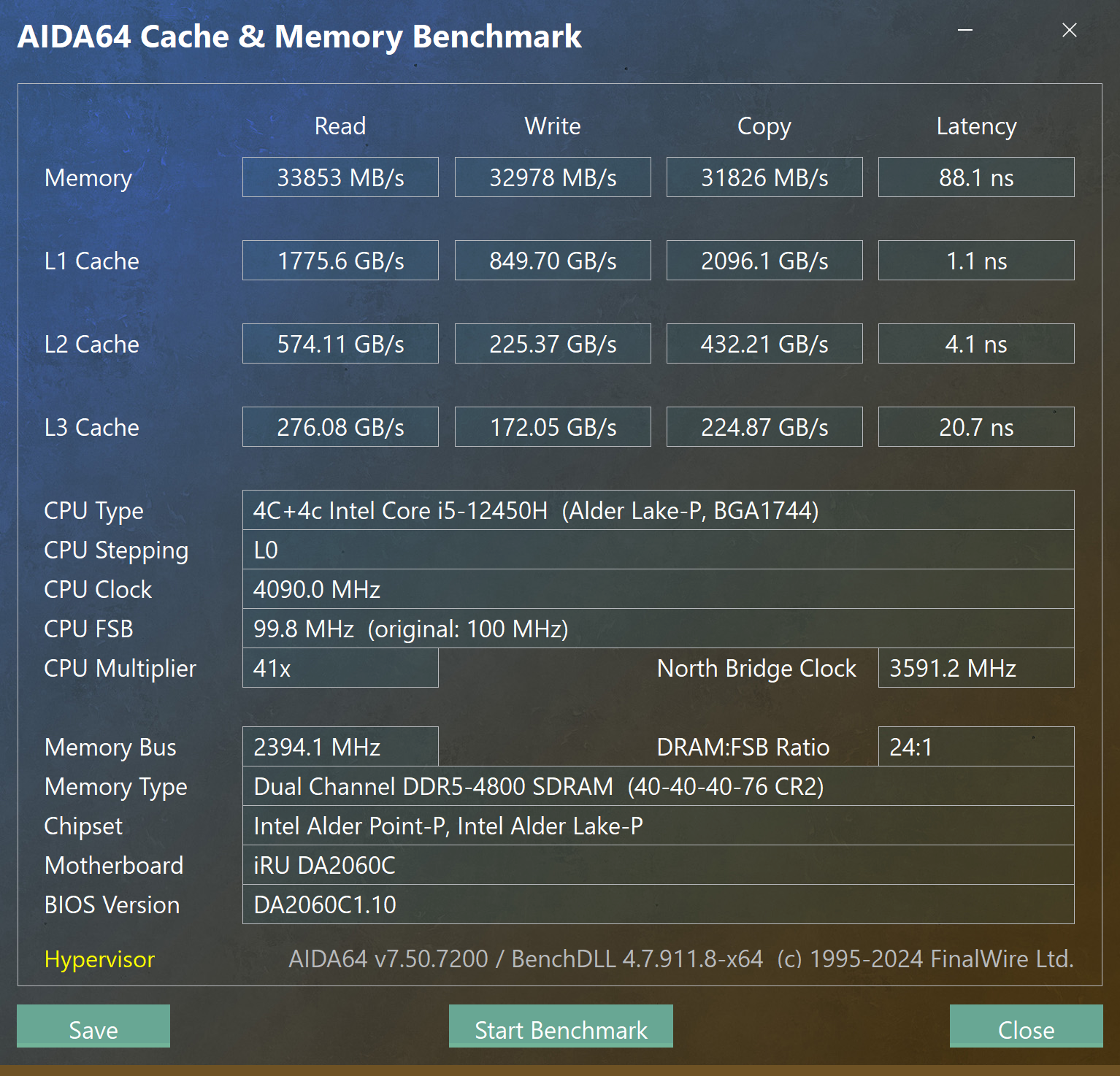 В тесте AIDA64 Cache & Memory Benchmark оперативная память показывает пропускную способность на уровне ≈33,9 ГБ/с при чтении, ≈33,0 ГБ/с при записи и ≈31,8 ГБ/с при копировании, с задержкой 88 нс. Такие значения соответствуют одноканальной конфигурации и ожидаемы для используемой платформы. Кэш-подсистема процессора работает без отклонений: L1 демонстрирует крайне высокую пропускную способность и минимальную латентность, L2 и L3 — заметно более низкие, но стабильные показатели с логичным ростом задержек.