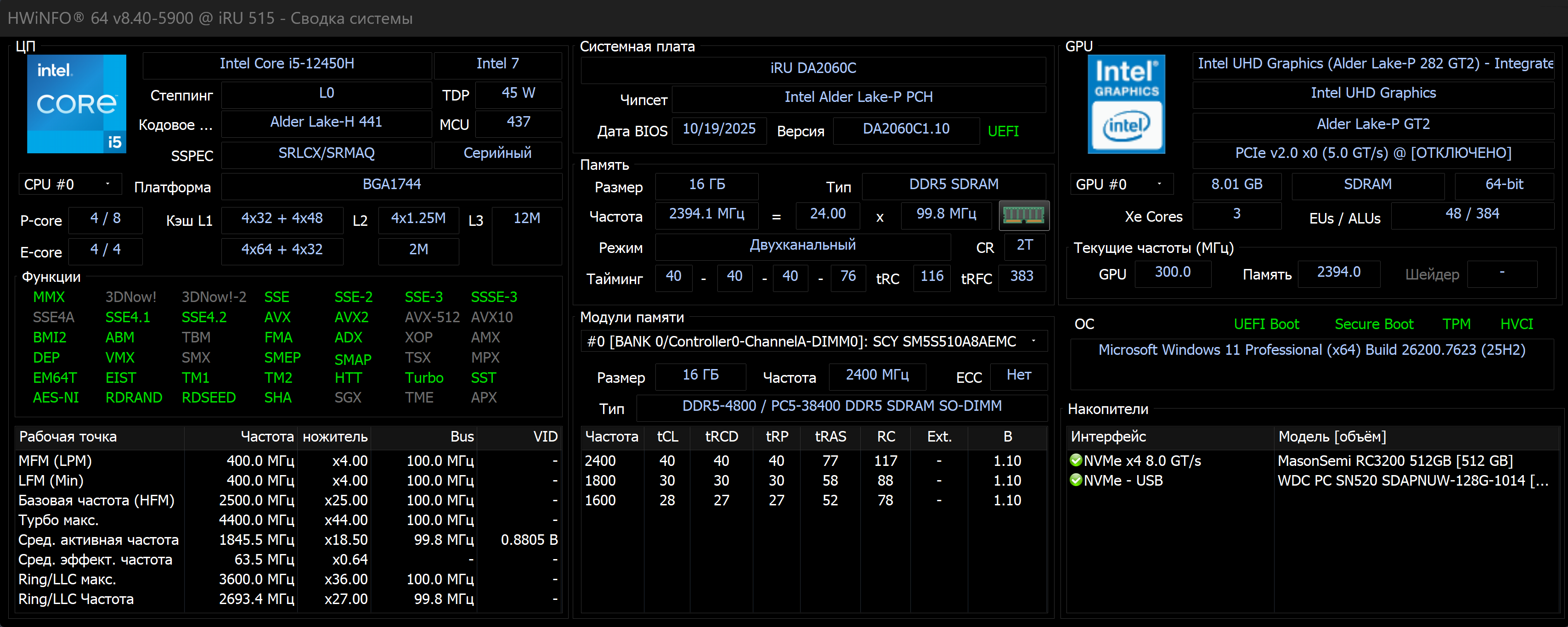 Именно поэтому в данном обзоре мы рассматриваем конфигурацию iRU Tactio 515 на процессоре Intel Core i5-12450H. Это мобильный чип с теплопакетом 45 Вт, который обеспечивает высокий уровень однопоточной производительности и заметно увереннее ведет себя в многозадачных сценариях по сравнению с более бюджетными решениями. В сочетании с 16 ГБ оперативной памяти DDR5 и NVMe-накопителем такая платформа ориентирована на интенсивную повседневную деятельность — без претензий на роль мощной рабочей станции, но и без постоянного дефицита вычислительных ресурсов.