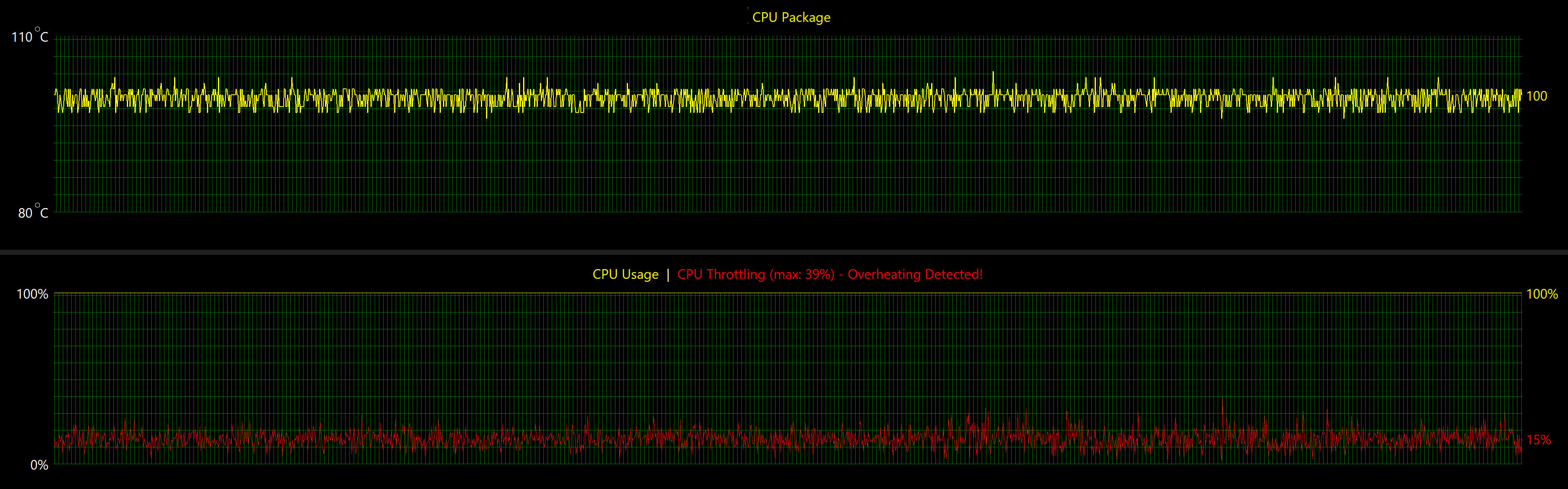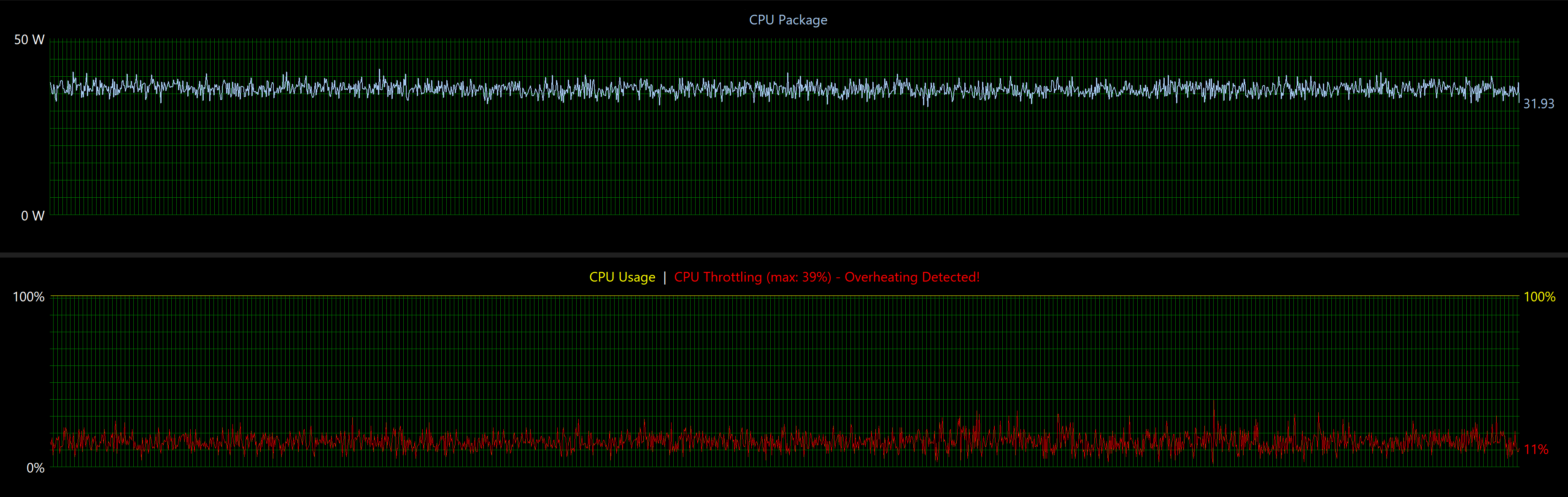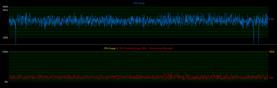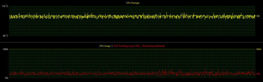 График энергопотребления показывает, что при длительной полной загрузке процессор удерживается на уровне порядка 30-32 Вт, без попыток выйти на более высокие значения. На фоне температуры около 100 °C и зафиксированного троттлинга это указывает на жесткое ограничение по тепловому бюджету: система стабилизируется не за счет роста оборотов или увеличения отвода тепла, а через ограничение потребляемой мощности и рабочих частот.
