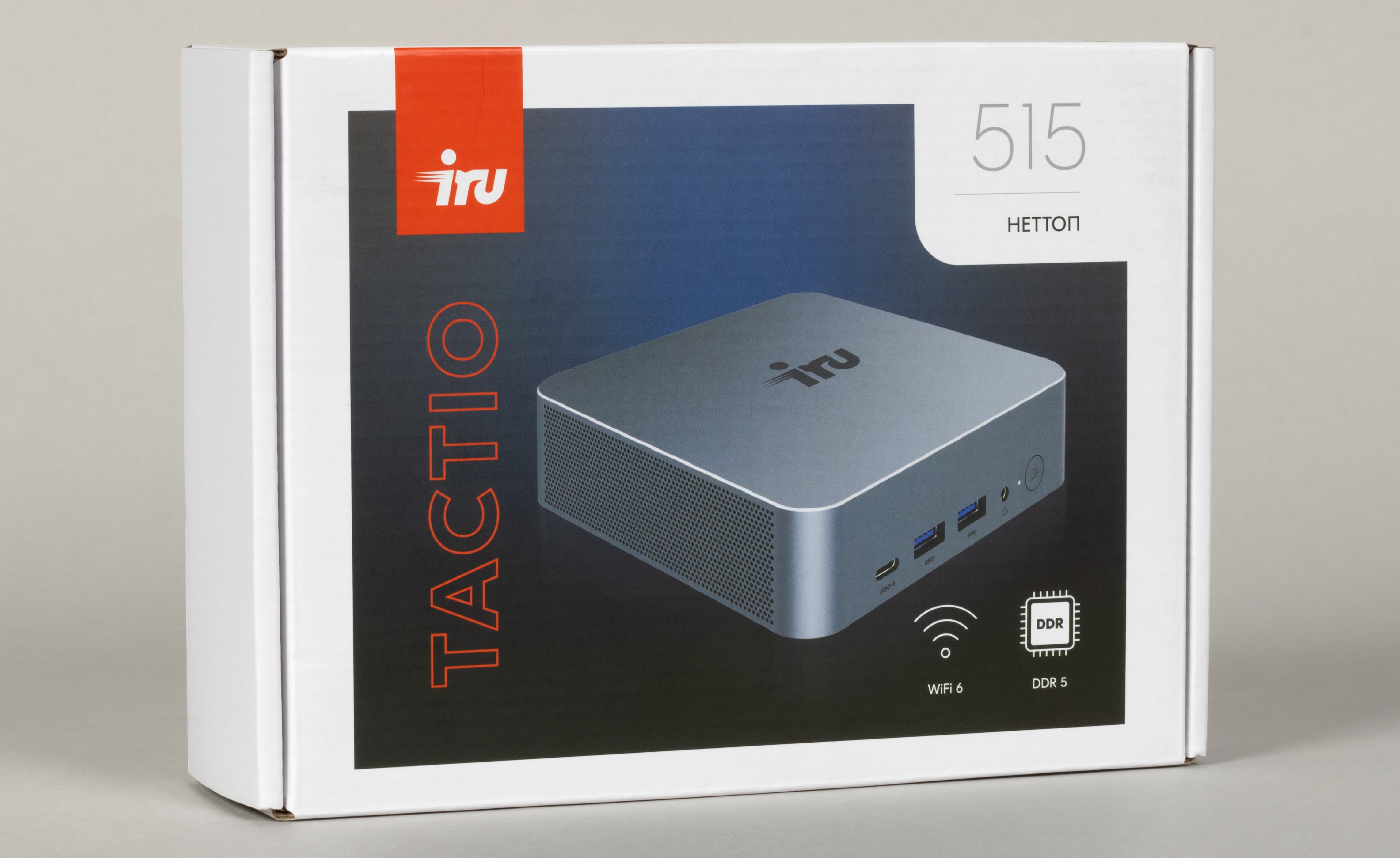 Как и другие устройства серии, iRU Tactio 515 поставляется в белой коробке из плотного картона с откидной крышкой, на которую нанесены название модели и изображение устройства. Внутри сам мини-ПК и комплектующие надежно зафиксированы при помощи картонных вставок, что обеспечивает защиту при транспортировке.