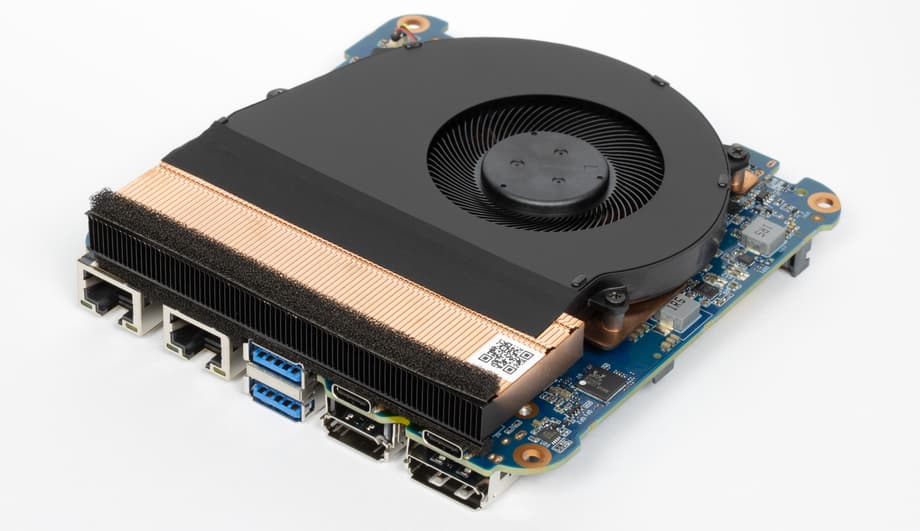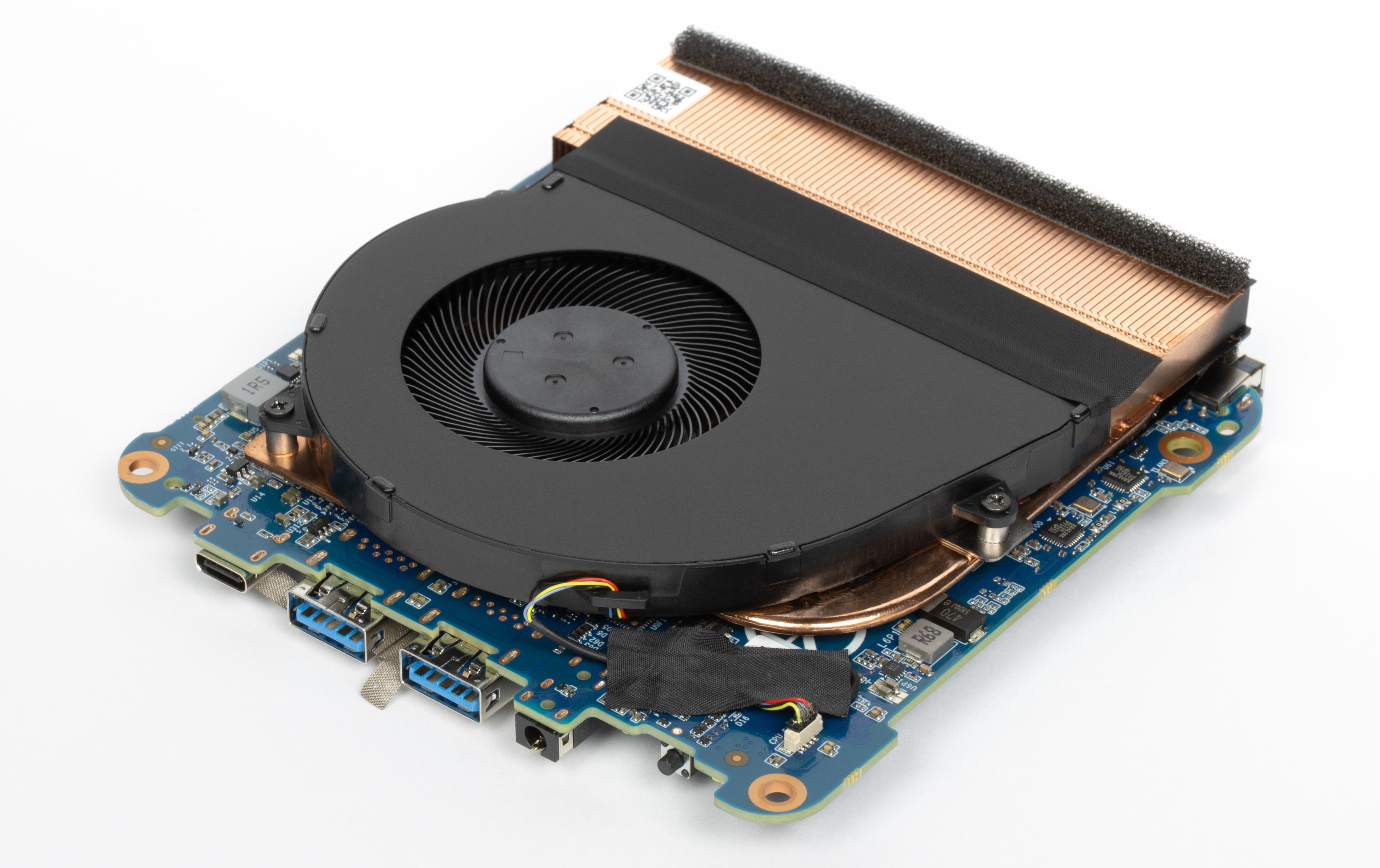 На обращенной ко дну стороне платы размещена система охлаждения, выполненная по классической для компактных ПК схеме: используются низкопрофильный радиальный кулер с оптимизированной формой лопастей, медные тепловые трубки и плотный ребристый радиатор.
