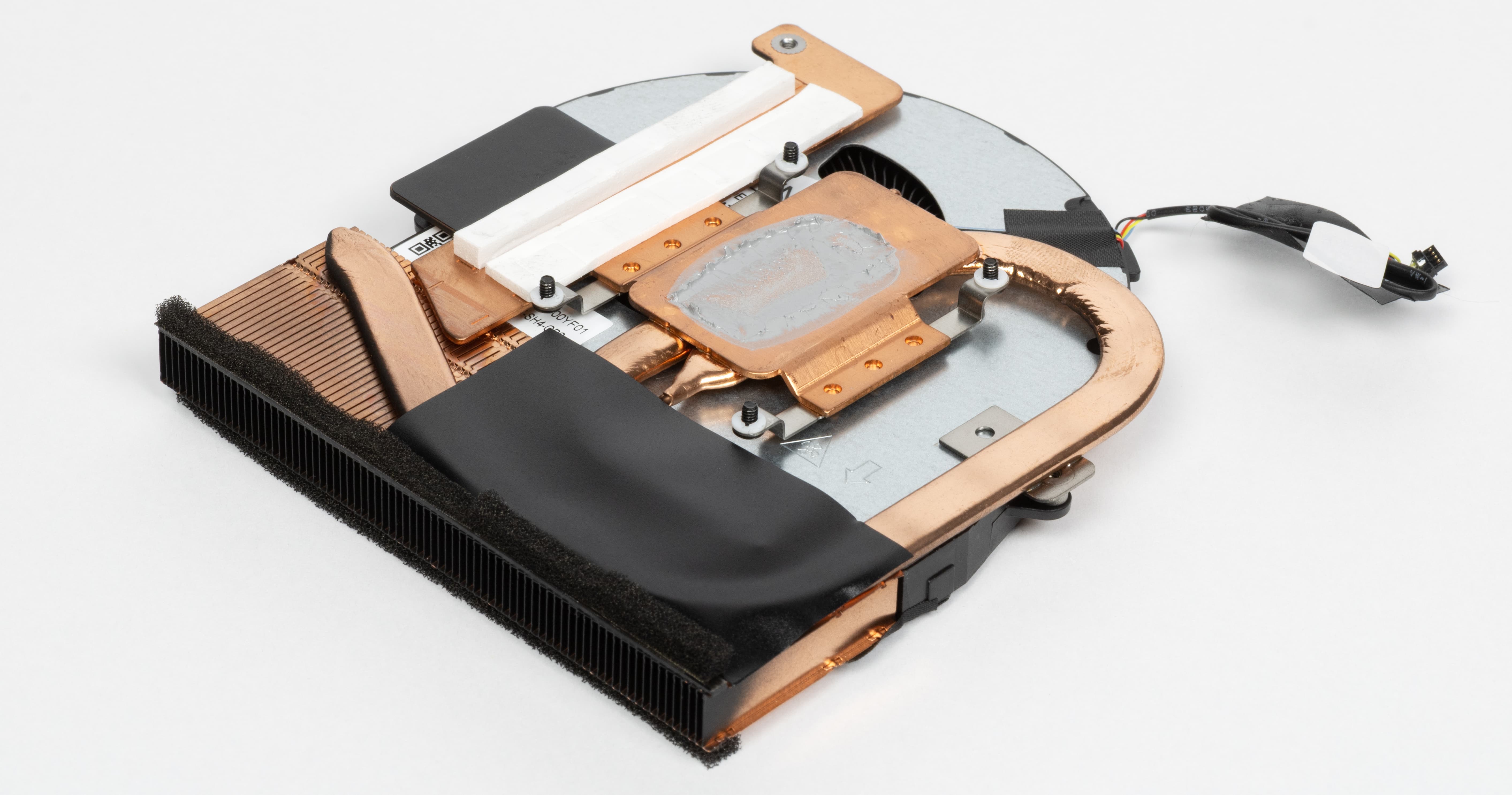 После демонтажа системы охлаждения хорошо видно, что контакт с процессором организован аккуратно: слой термопасты нанесен ровно в необходимом объеме, пятно контакта правильной формы, без перекосов и избытка. Тепло от процессора отводится через медное основание и тепловые трубки, которые равномерно распределяют его к радиаторному блоку. Трубки имеют стандартную для компактных систем форму и длину, без излишних изгибов, что снижает упрощает отвод тепла к зоне выдува.