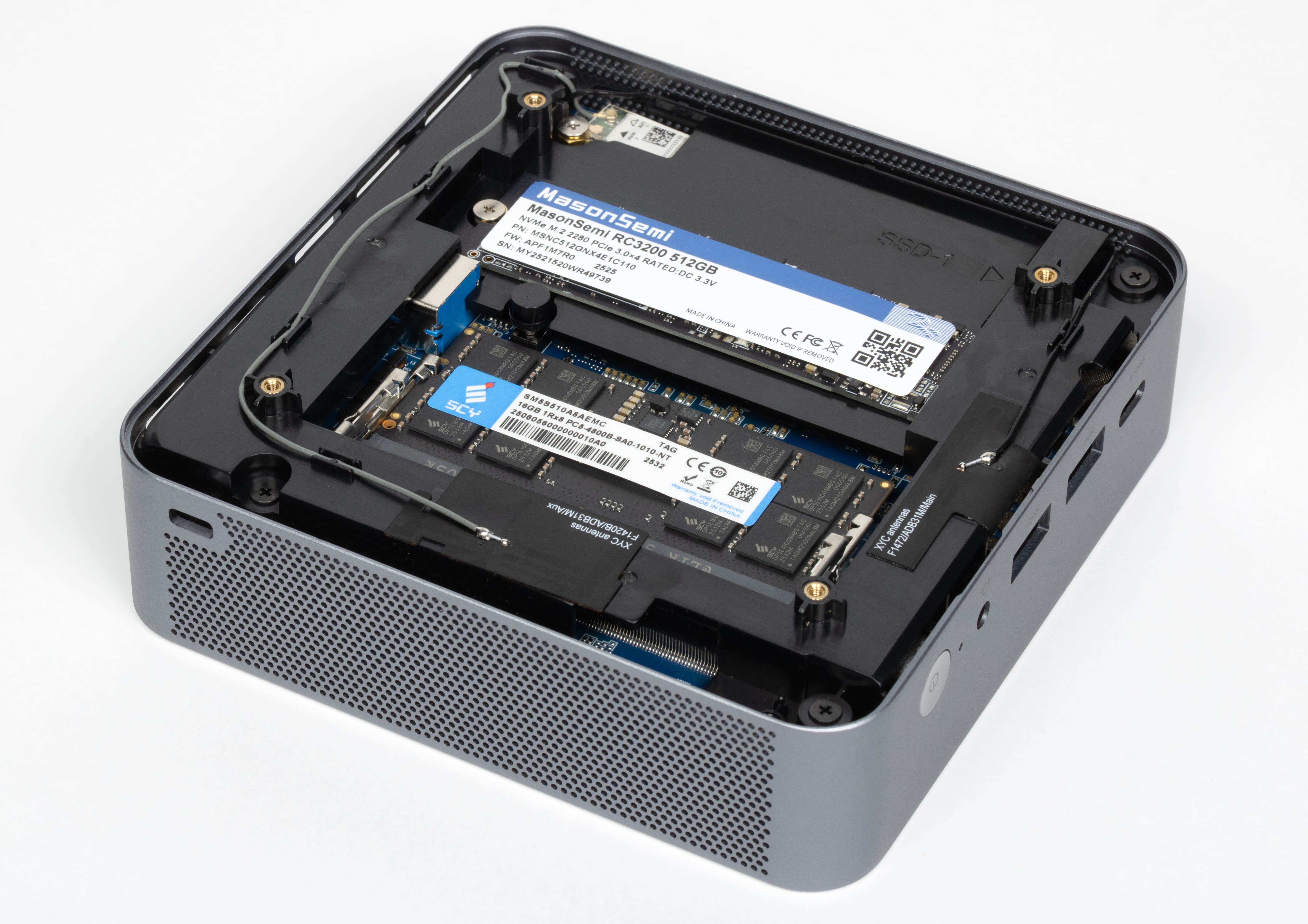В тестируемой конфигурации используется твердотельный накопитель MasonSemi RC3200 формата M.2 2280 объемом 512 ГБ, работающий по интерфейсу PCIe 3.0 x4. Это типичное NVMe-решение без DRAM-кеша, ориентированное на повседневную нагрузку: работу операционной системы, браузер, корпоративное ПО и хранение документов. По уровню производительности такой накопитель соответствует среднему классу и хорошо вписывается в задачи офисного мини-ПК. Для сценариев с постоянной интенсивной записью больших объемов данных он не предназначен, однако в рамках повседневной офисной эксплуатации показывает себя уверенно и при этом не приводит к излишнему удорожанию продукта.