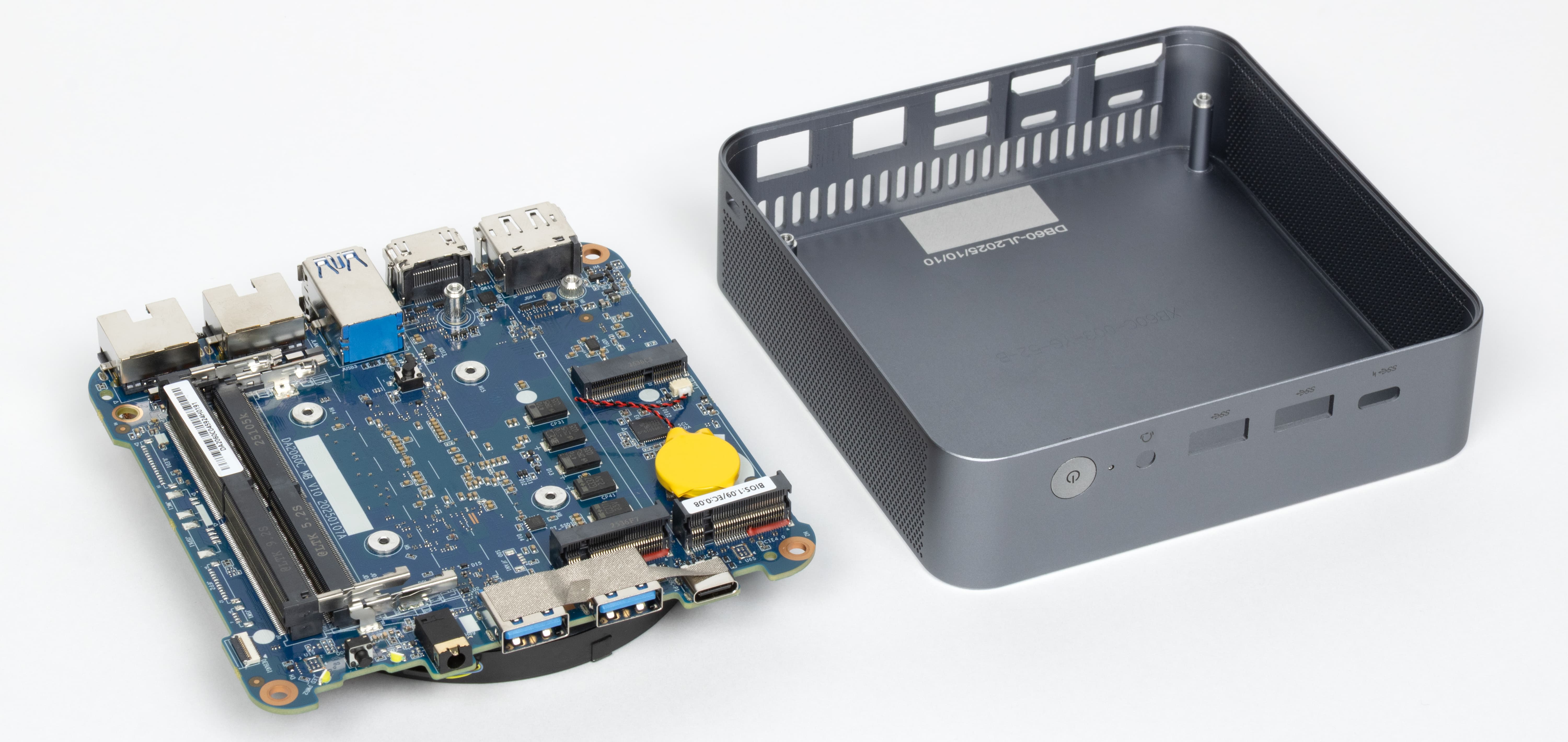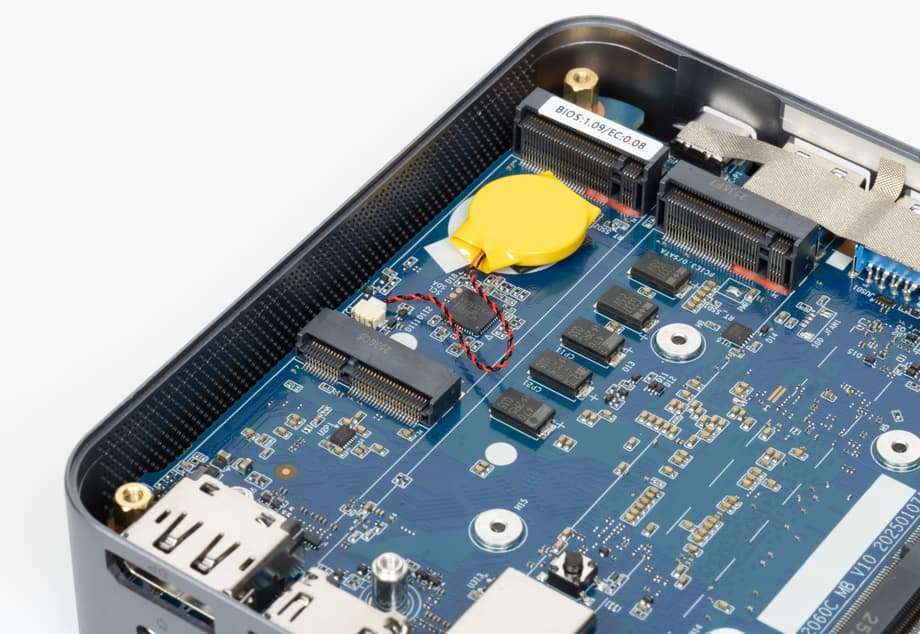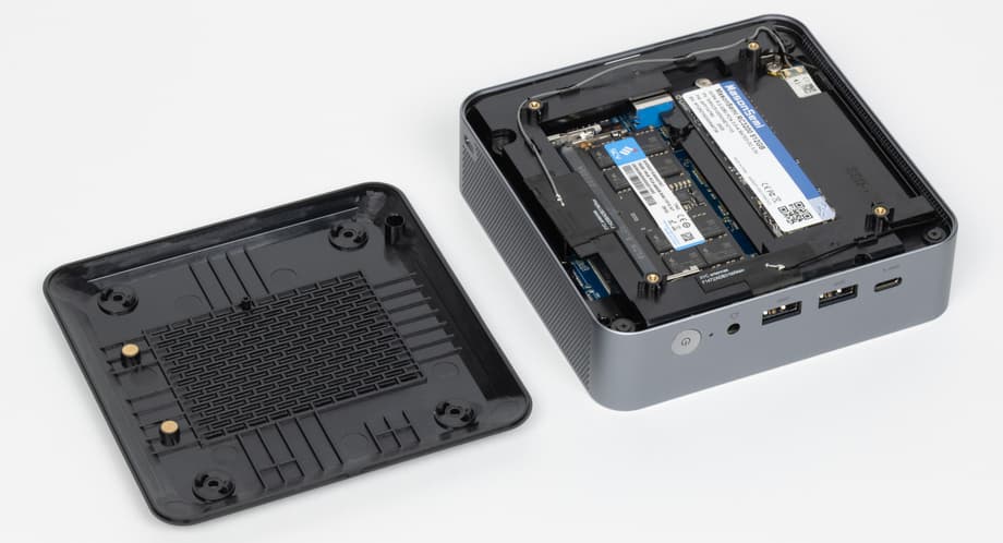 Нижняя панель мини-ПК крепится на винтах и легко снимается. Конструкция без защелок и лишних удерживающих элементов упрощает разборку и делает апгрейд или обслуживание более удобными, без риска что-то повредить в процессе.