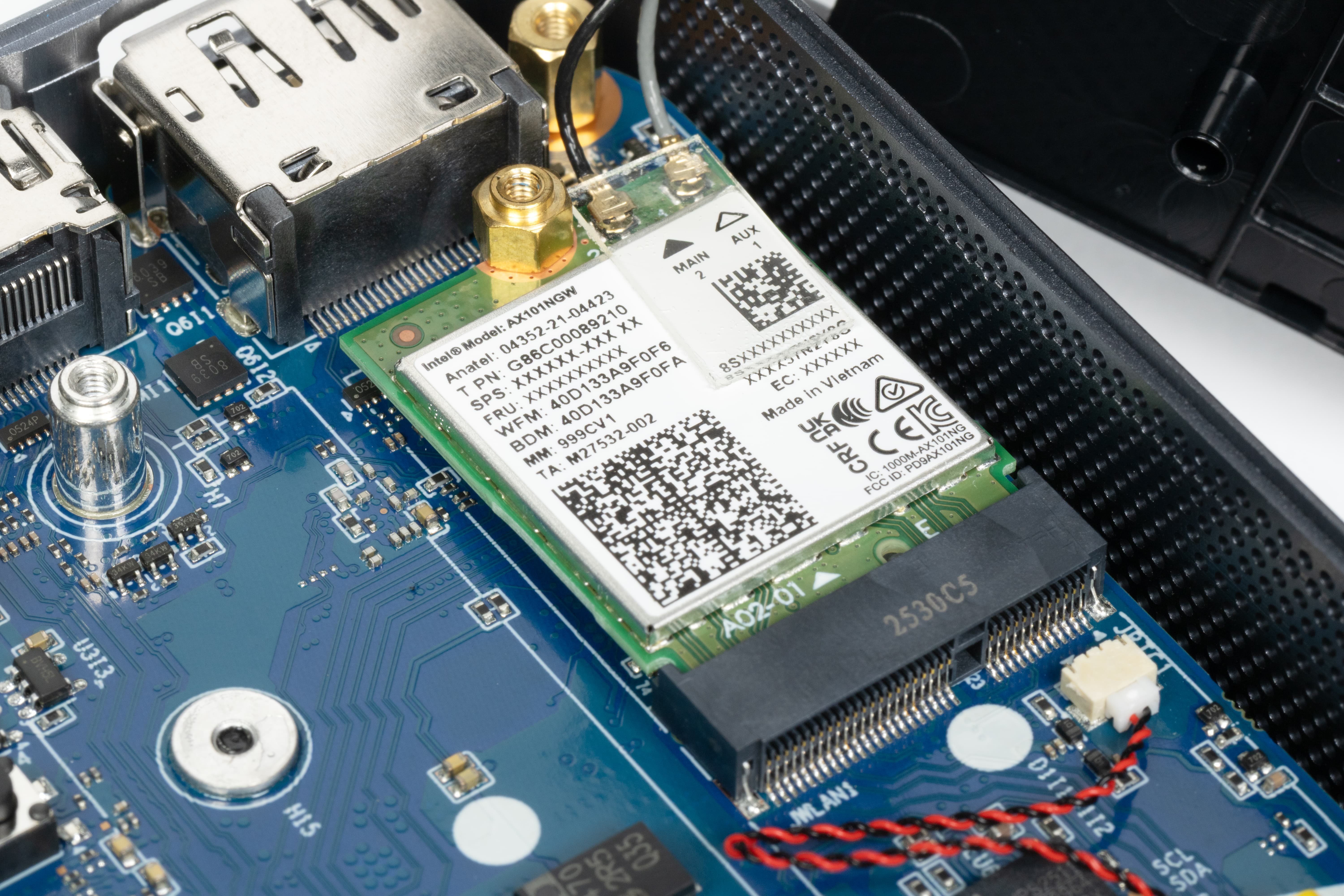 Модуль беспроводной связи установлен в отдельном слоте M.2, поэтому при необходимости его можно без труда заменить. В штатной конфигурации используется Intel AX101NGW — современный модуль Wi-Fi и Bluetooth. Поддержка Wi-Fi 6 обеспечивает стабильную работу в корпоративных беспроводных сетях и при видеосвязи, что особенно важно для офисов с высокой плотностью подключенных устройств и активным использованием онлайн-коммуникаций.
