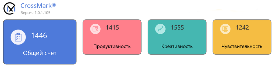 В интегральном тесте CrossMark v1.0.1.105 система набирает 1446 баллов. Это умеренный результат, характерный для офисных и корпоративных мини-ПК с ограниченным энергопакетом: он отражает сбалансированное, но не ориентированное на пиковую производительность поведение под смешанной нагрузкой. Поскольку CrossMark агрегирует несколько прикладных сценариев, итоговый балл сам по себе вторичен — более показательно распределение результатов по отдельным разделам.