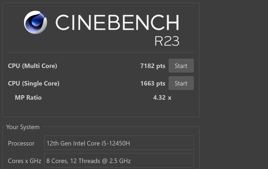 В Cinebench R23 система показывает 7182 балла в многопоточном режиме и 1663 балла в однопоточном. Однопоточная производительность находится на нормальном для мобильных Core i5 уровне и обеспечивает быстрый отклик в интерфейсе и прикладных задачах.
