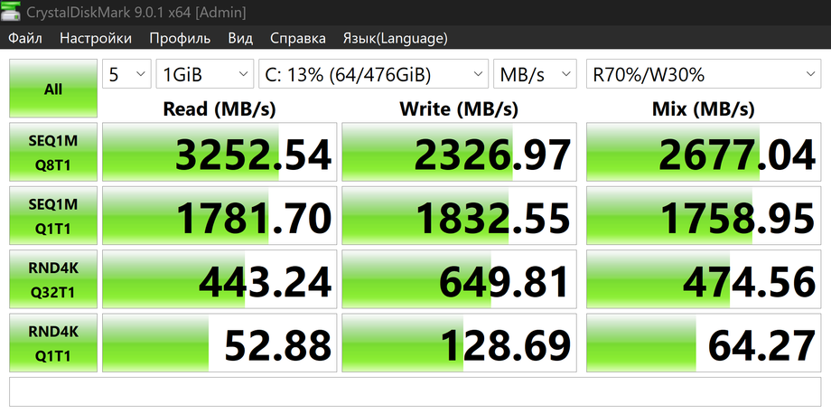 В тесте CrystalDiskMark 9.0.1 накопитель демонстрирует скорость последовательного чтения на уровне около 3250 МБ/с и записи порядка 2300 МБ/с, что соответствует возможностям интерфейса PCIe 3.0 x4. Показатели случайного доступа также находятся в ожидаемом диапазоне для NVMe-решений без DRAM-кеша и обеспечивают корректную работу системы. В целом полученные результаты укладываются в расчетный уровень производительности для данного класса накопителей и платформы в целом, без аномалий и заметных просадок, обеспечивая необходимый и достаточный запас скорости для задач, на которые ориентирован мини-ПК.