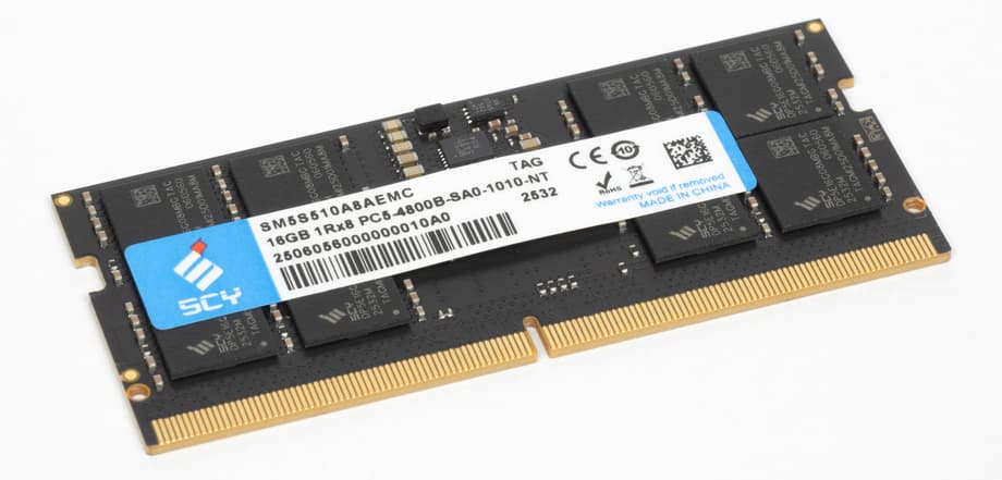 Установлен один модуль оперативной памяти объемом 16 ГБ от бренда SCY (Shenzhen Shichuangyi Electronics Co., Ltd.) — китайского производителя, работающего с 2008 года и специализирующегося на выпуске DRAM-модулей, SSD и встроенной памяти, в том числе в формате OEM-поставок для системных интеграторов. Память работает в одноканальном режиме, по пропускной способности он уступает двухканальному, однако упрощает апгрейд: при необходимости объем можно увеличить до 32 ГБ, просто добавив вторую планку, без замены уже установленной памяти — в отличие от конфигураций с двумя модулями меньшего объема.