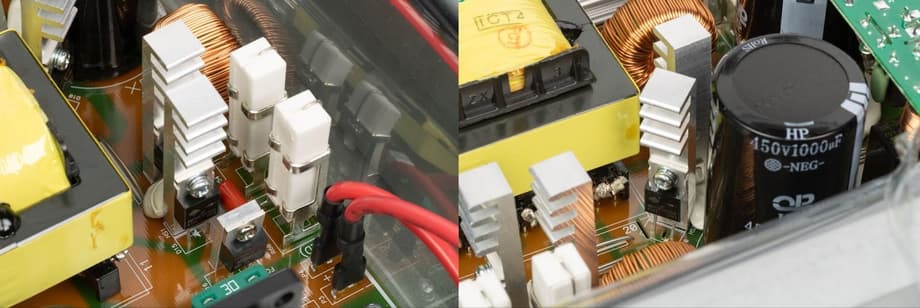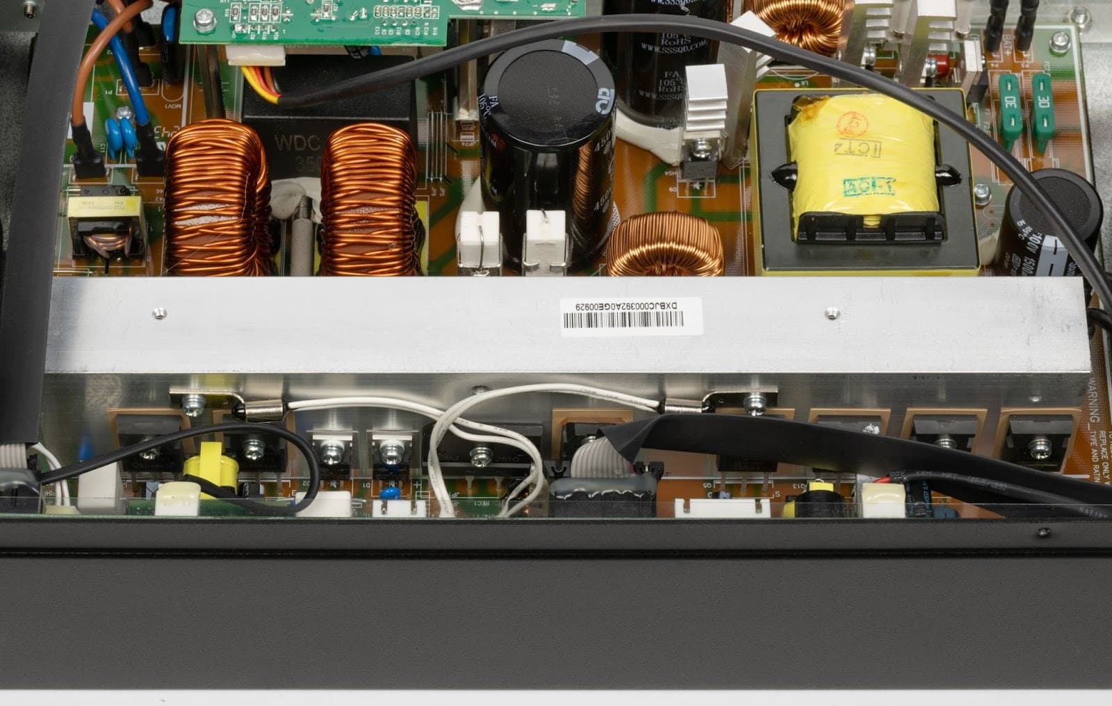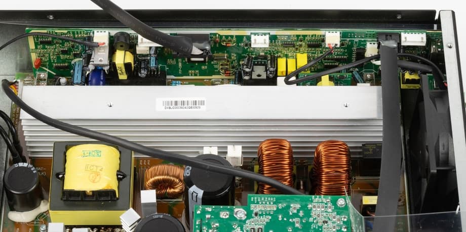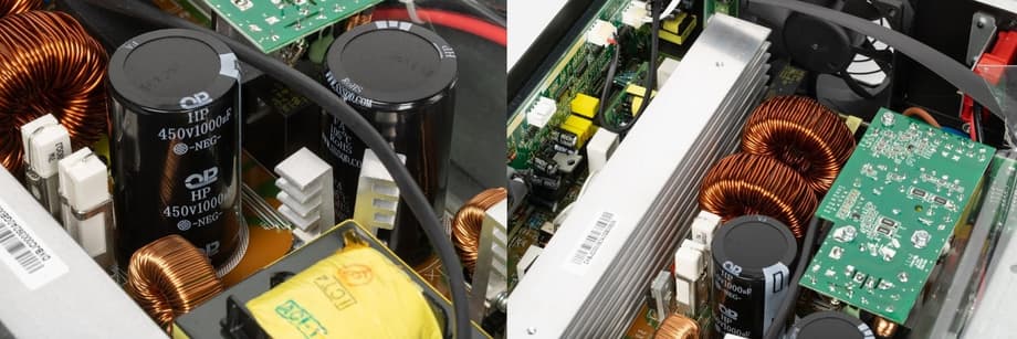 Входной каскад выполнен с активным корректором коэффициента мощности — это хорошо читается по паре крупных дросселей и высоковольтным электролитическим конденсаторам, формирующим DC-шину с заметным запасом по рабочему напряжению. Само DC-звено собрано без излишней миниатюризации, с нормальной дистанцией между силовыми элементами, что снижает уровень паразитных наводок и облегчает контроль тепловых режимов.