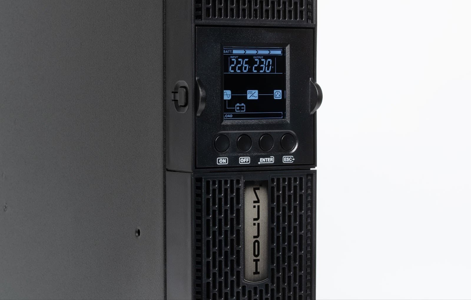 Модуль с экраном и кнопками можно развернуть на 90° при вертикальной установке ИБП. Для этого он вынимается из посадочного места за боковые «ушки», после чего устанавливается в нужной ориентации. Кнопка фиксации защелки расположена на нижней стороне устройства, которая при вертикальном размещении устройства оказывается слева.