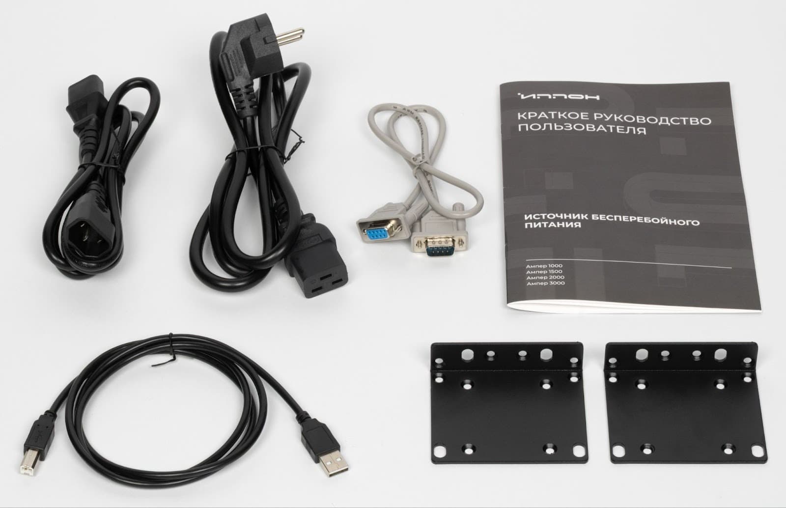 В комплект поставки входят документация, сетевой кабель длиной 150 см, выходной кабель для подключения нагрузки длиной 150 см, кабель USB-A — USB-B длиной 120 см и кабель RS-232 длиной 60 см. Также в коробке есть монтажные планки для установки устройства в стойку и комплект крепежа для них. Эти же элементы могут использоваться как опоры при вертикальном размещении ИБП.