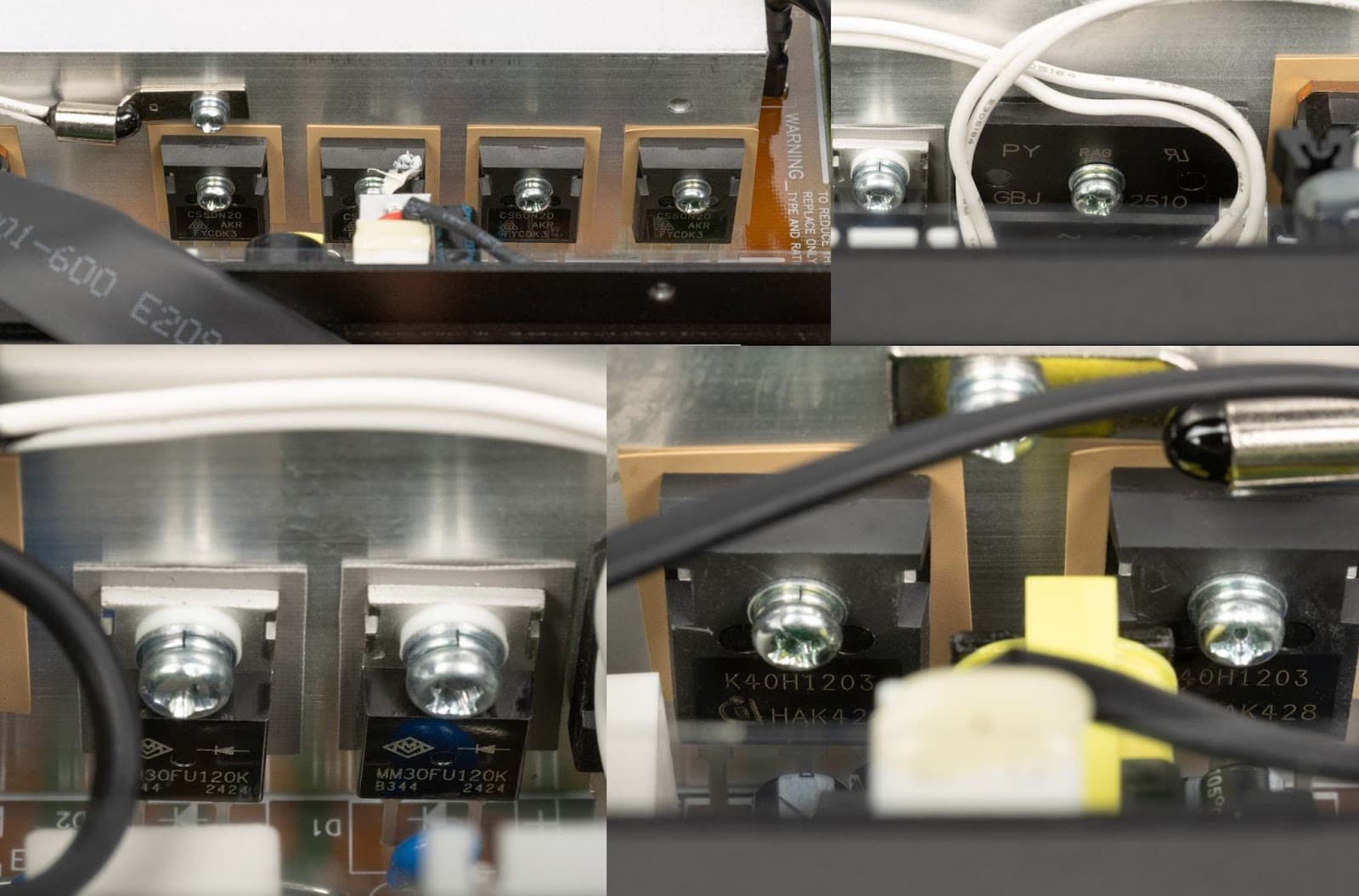 Используются корпусные силовые транзисторы, рассчитанные на высокий ток и напряжение, с классическим болтовым прижимом. Видно несколько групп транзисторов и выпрямительных элементов — их маркировка хорошо читается на фото, а сами компоненты размещены аккуратно и логично.