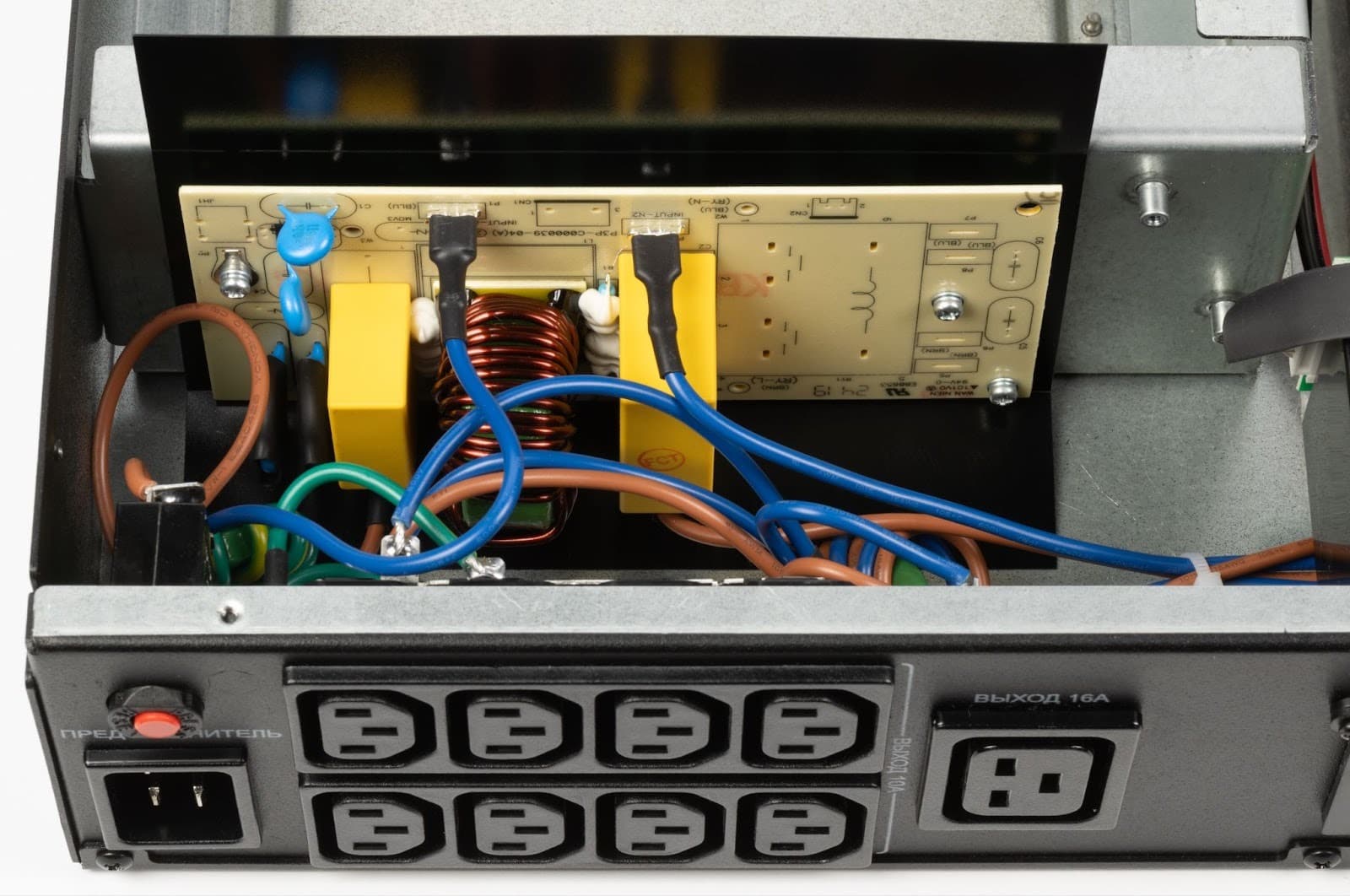 У выходных розеток установлена отдельная плата выходной фильтрации. На ней размещены элементы EMI/EMC-фильтра: дроссель, пленочные конденсаторы и защитные компоненты, отвечающие за подавление высокочастотных помех и «очистку» формы напряжения уже после инвертора. Такой подход снижает уровень шума на выходе, уменьшает взаимное влияние подключенной нагрузки и обеспечивает дополнительную защиту чувствительного оборудования.