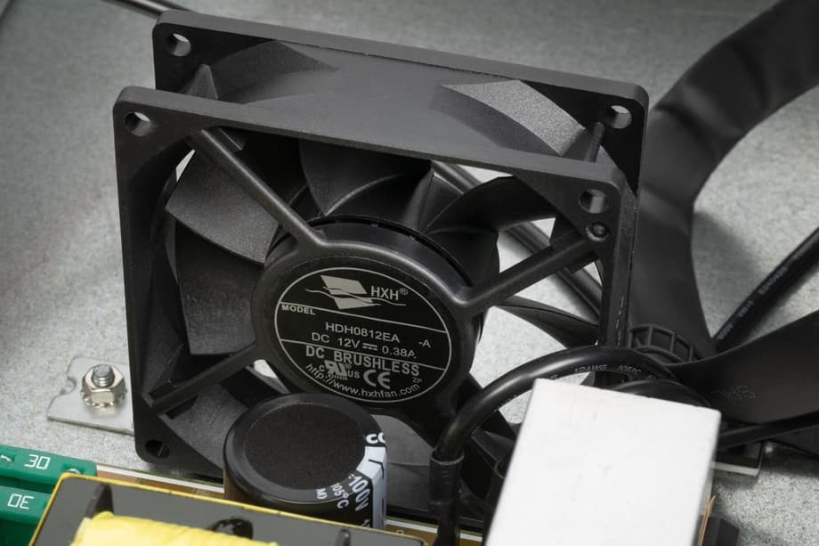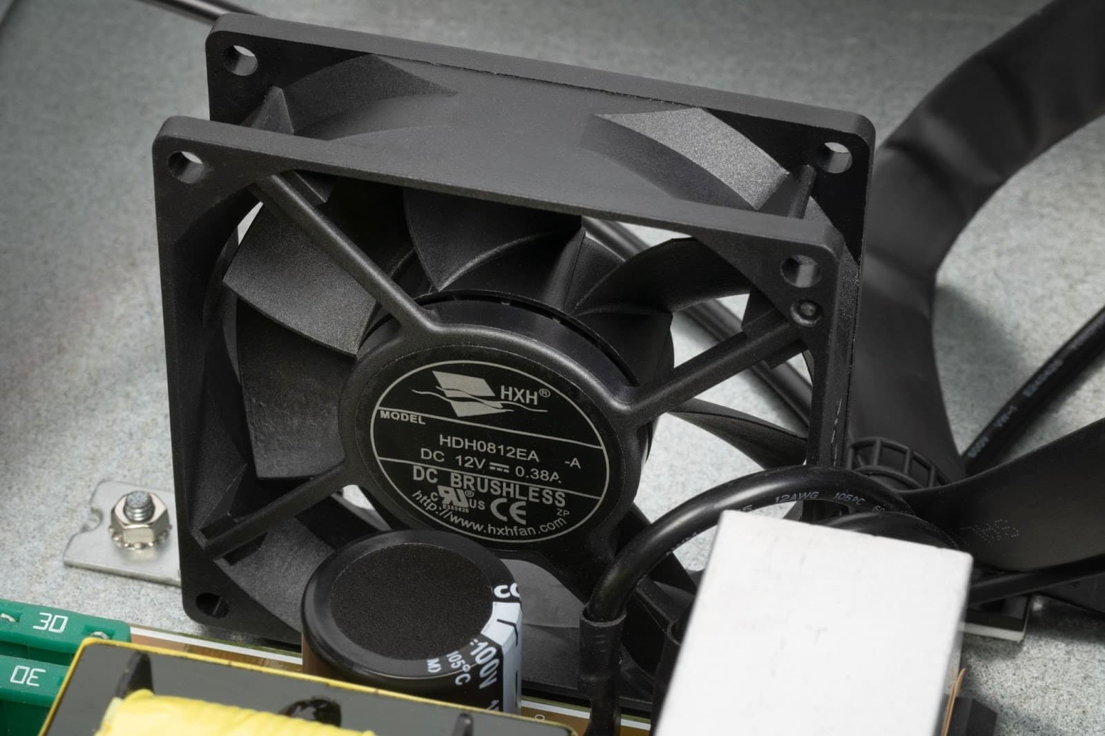 Используются два стандартных осевых DC-вентилятора HXH HDH0812EA-A на 12 В — приточный и вытяжной, с потребляемым током около 0,38 А каждый. Это не маломощные вентиляторы, но и не модели с повышенным статическим давлением, рассчитанные на работу со сложными или протяженными воздуховодами.