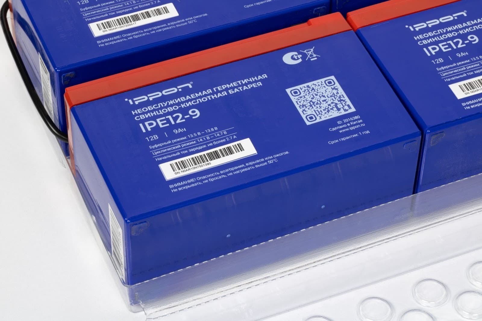 В батарейном модуле используются стандартные необслуживаемые свинцово-кислотные аккумуляторы формата 12 В 9 А·ч. Судя по маркировке, они рассчитаны как на буферный режим, так и на циклическую работу, что важно для сценариев с регулярными отключениями питания.