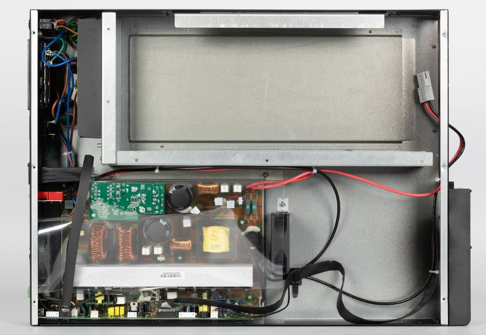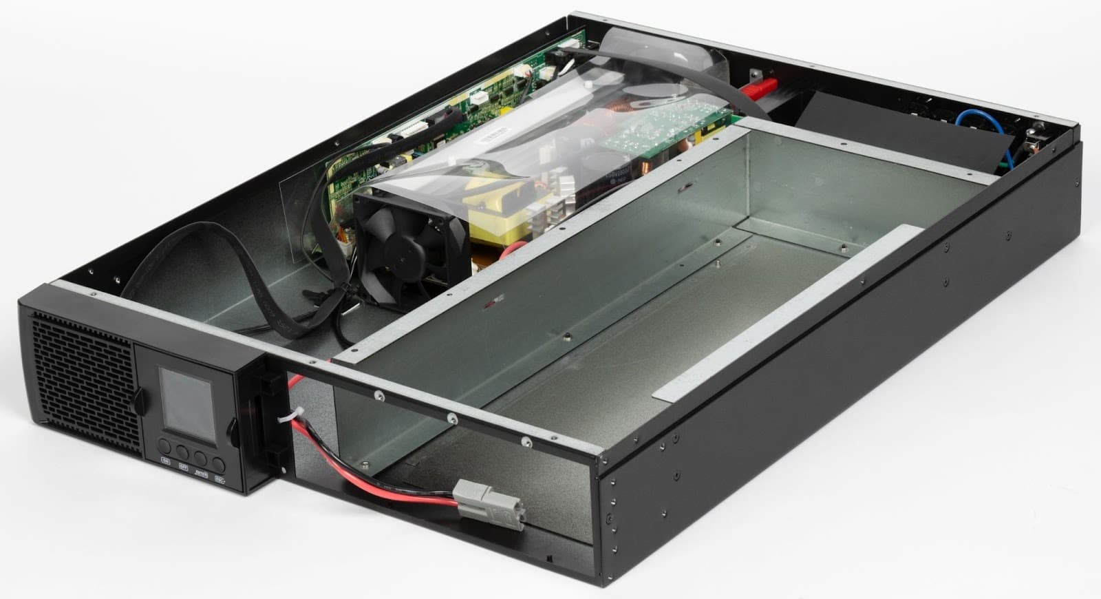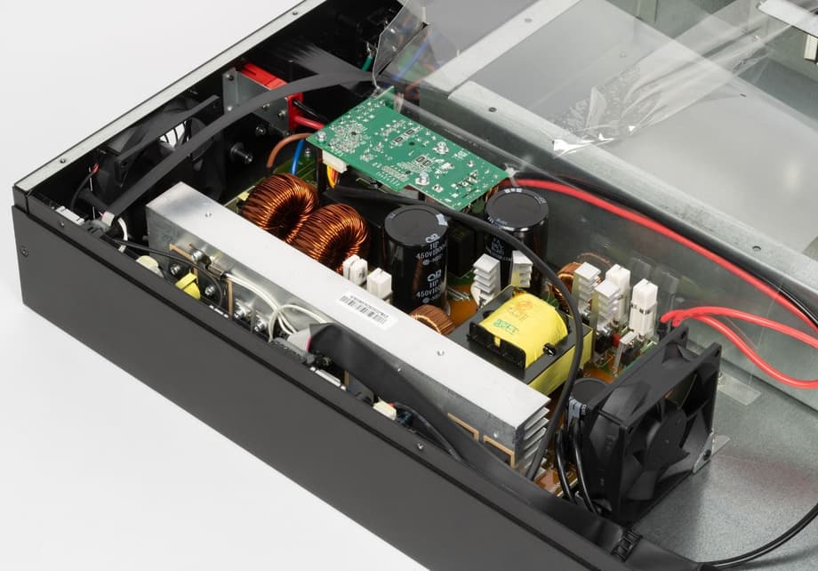 Внутренняя компоновка ИБП выглядит аккуратной и логично организованной, с четким разделением зон по функциональному назначению и заметным запасом по внутреннему объему. Одна часть корпуса полностью отведена под батарейный отсек, который механически изолирован от силовой электроники и усилен металлическими направляющими, другая — под силовые узлы. В целом внутри корпуса остается много свободного пространства, что положительно сказывается на воздушных потоках и тепловом режиме, а также упрощает доступ при обслуживании или ремонте. Кабельная разводка выполнена без излишней плотности: силовые линии имеют увеличенное сечение и уложены аккуратно.