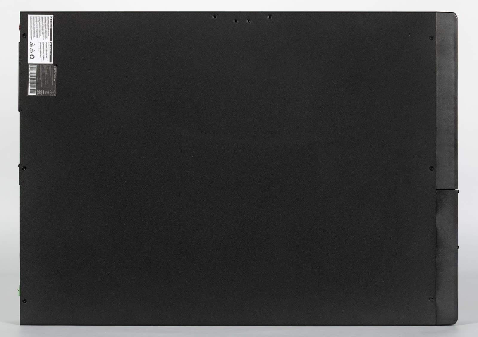 На противоположной стороне корпуса каких-либо примечательных элементов нет, за исключением наклейки с краткой технической информацией. Поверхность корпуса матовая, устойчивая к истиранию и загрязнениям.