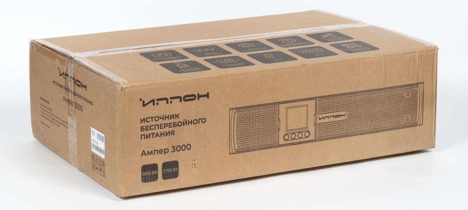 ИБП «Иппон Ампер 3000» поставляется в коробке из плотного неокрашенного картона с нанесенными изображениями устройства и основными техническими характеристиками. Внутри сам ИБП упакован в защитный пакет и надежно зафиксирован пенопластовыми вставками, что снижает риск повреждений при транспортировке.
