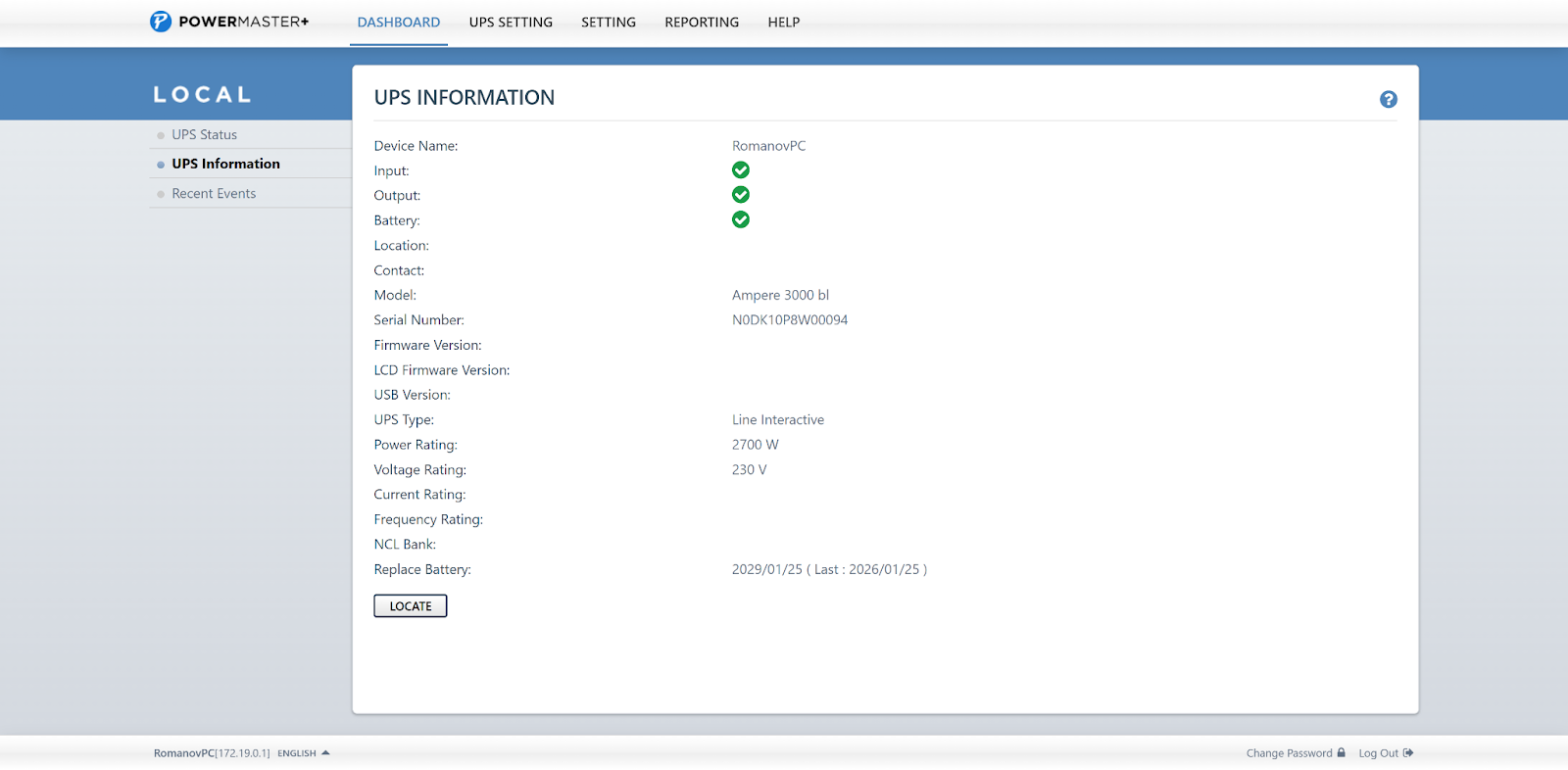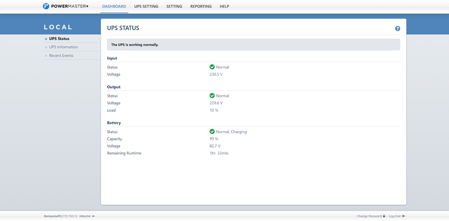 Самый простой сценарий предполагает подключение ИБП к компьютеру по USB, однако доступны и другие варианты — в том числе использование дополнительной SNMP-карты для организации сетевого управления. На главной странице приложения отображается базовая информация об устройстве: текущий статус, входное и выходное напряжение, уровень нагрузки и состояние аккумуляторов. Здесь же появляются сообщения о важных событиях и изменениях в работе ИБП.