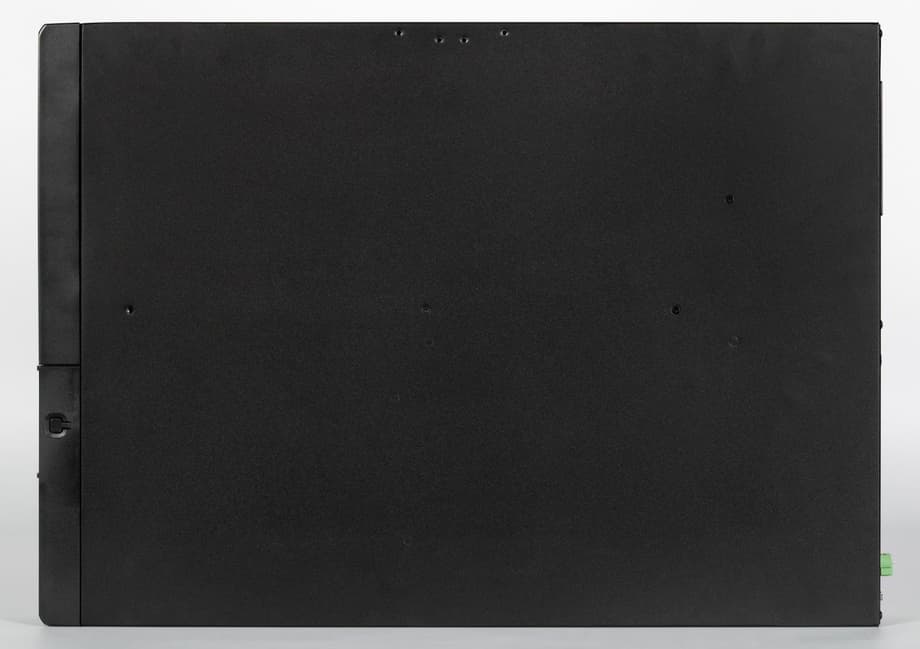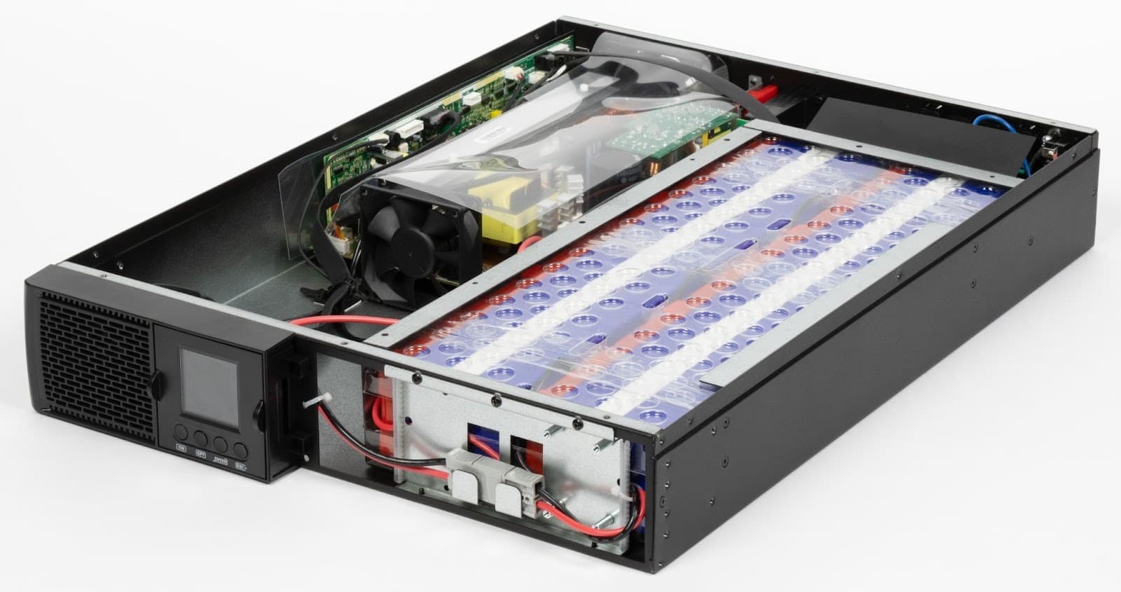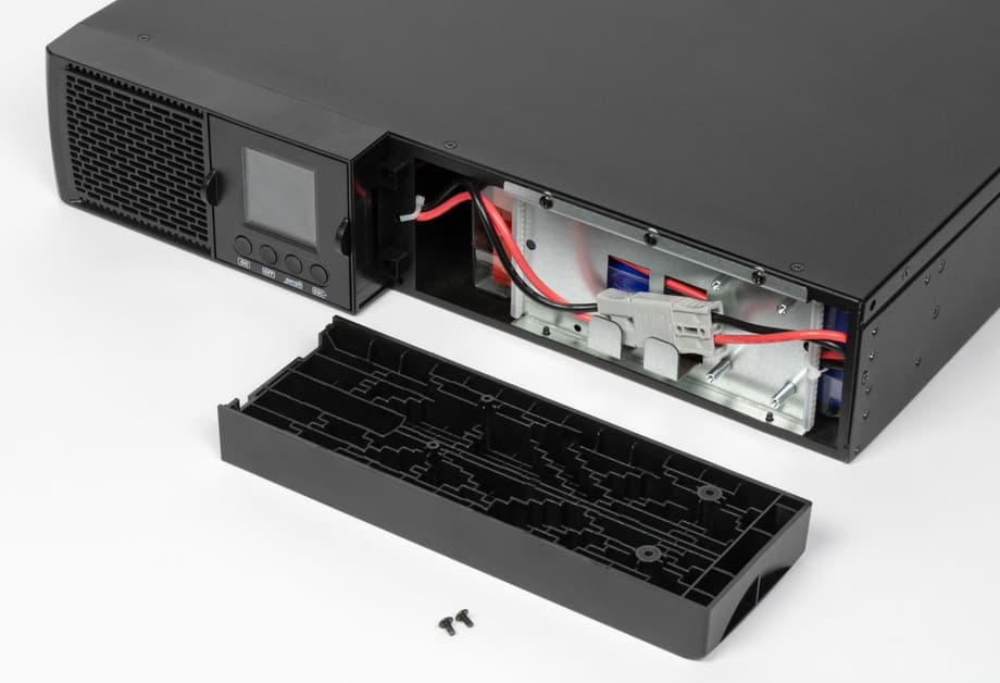 Аккумуляторный отсек расположен за съемной частью фронтальной панели, поэтому для замены батарей не требуется разбирать корпус целиком. Такой подход особенно удобен при установке в стойку — извлекать ИБП из нее не нужно. Батарейный отсек конструктивно отделен от силовой электроники и вынесен в отдельную зону, что упрощает обслуживание и снижает риски при эксплуатации.
