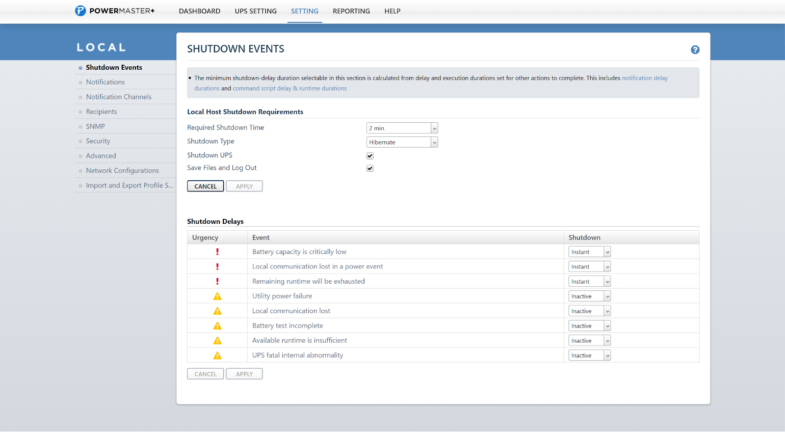 Перед отключением питания ИБП корректно завершает работу подключенных ПК. Можно задать сценарий завершения — перевод в гибернацию или полное отключение, а также настроить события, при которых этот механизм будет срабатывать.