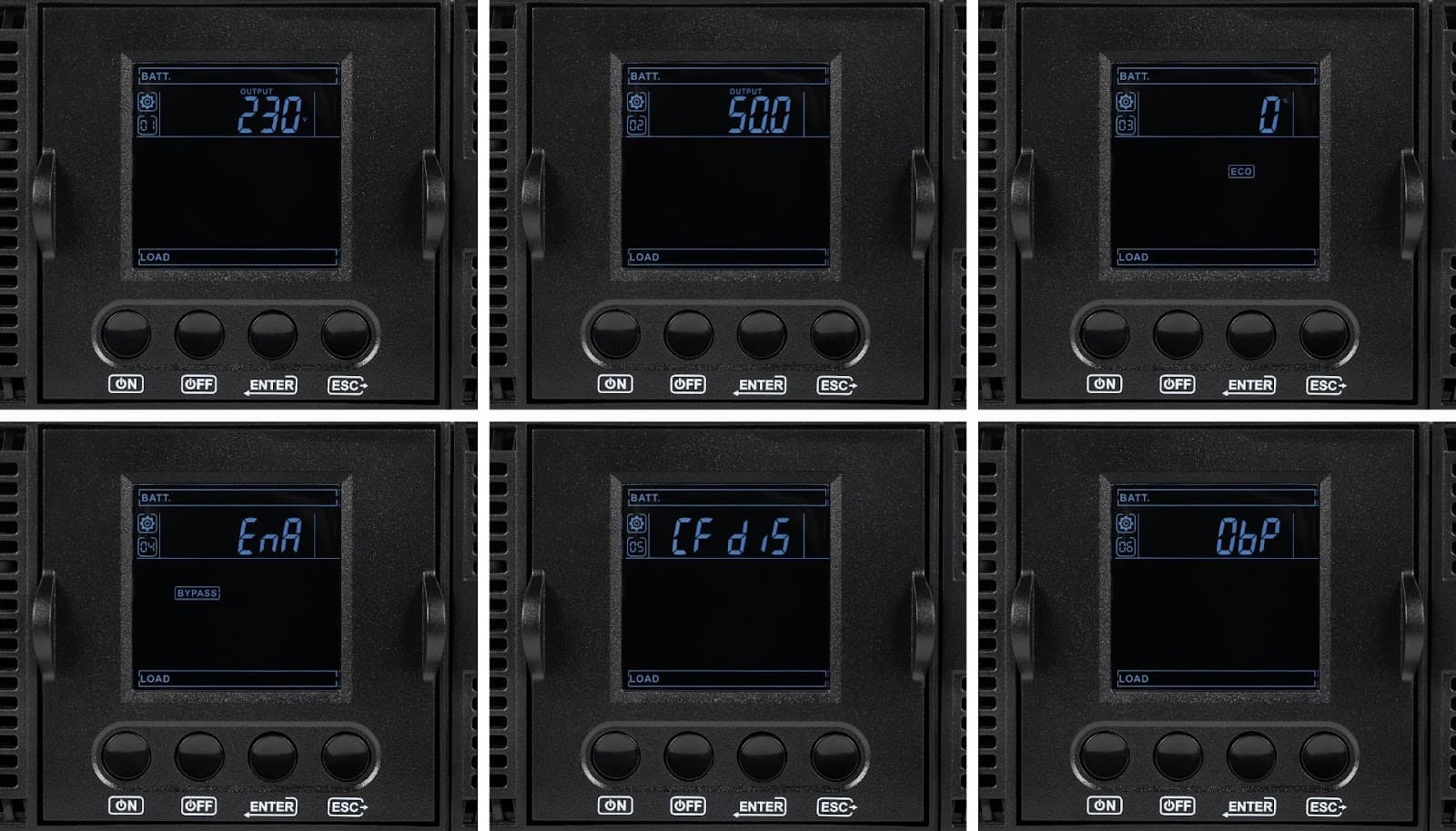 Также предусмотрены комбинированные действия: при нормальном сетевом питании одновременное нажатие кнопок ENTER и ESC переводит ИБП в режим байпаса. В меню настроек доступны основные параметры работы устройства, влияющие на режимы питания и поведение ИБП в различных сценариях эксплуатации. Ниже приведен их краткий перечень — подробное описание каждого пункта можно найти в инструкции.