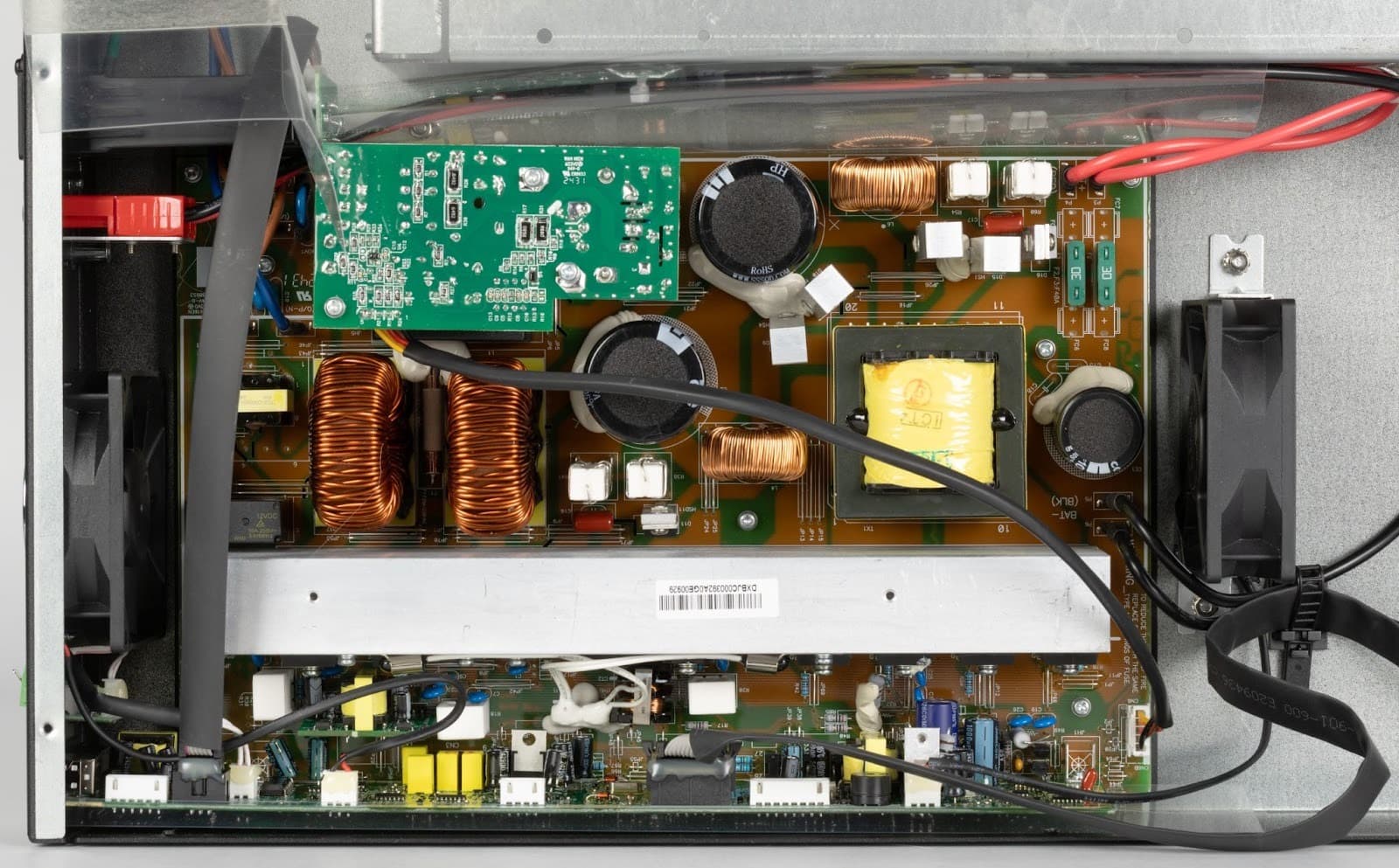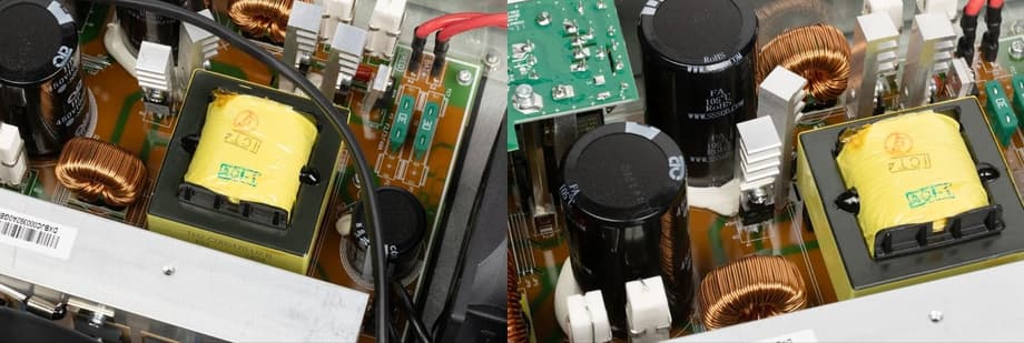 В центральной части размещен массивный высокочастотный силовой трансформатор, вокруг которого симметрично расположены дроссели выходного фильтра и электролитические конденсаторы, обеспечивающие сглаживание и стабилизацию выходного напряжения после инвертора.