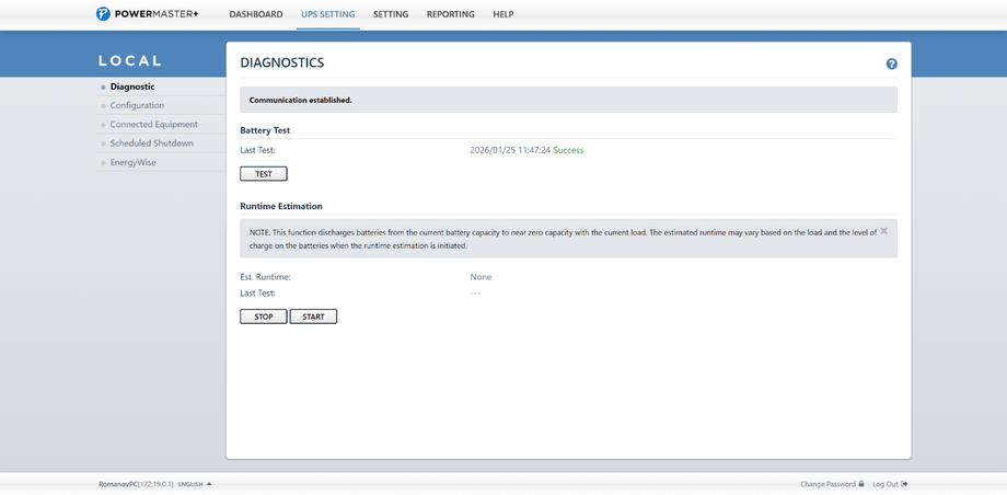 На вкладке диагностики доступны два очень полезных инструмента. Первый — тест аккумуляторов, позволяющий проверить их текущее состояние. Второй — оценка фактического времени автономной работы с подключенной нагрузкой. В ходе такого теста ИБП переключается на питание от батарей и фиксирует время до их разряда. Это позволяет оценить доступную автономность не по расчетам или таблицам, а на основе реальных измерений с конкретным комплектом оборудования.