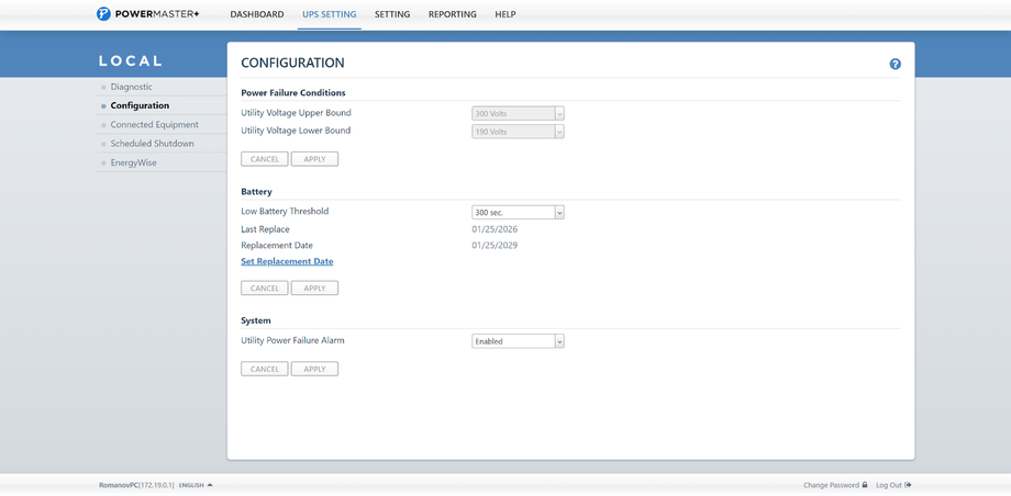 Верхняя и нижняя границы входного напряжения заданы по умолчанию и не подлежат изменению. После указания даты установки аккумуляторов система подсказывает, когда стоит задуматься об их замене. Также на вкладке настройки ИБП можно увидеть список подключенных устройств, задать время отключения и так далее.