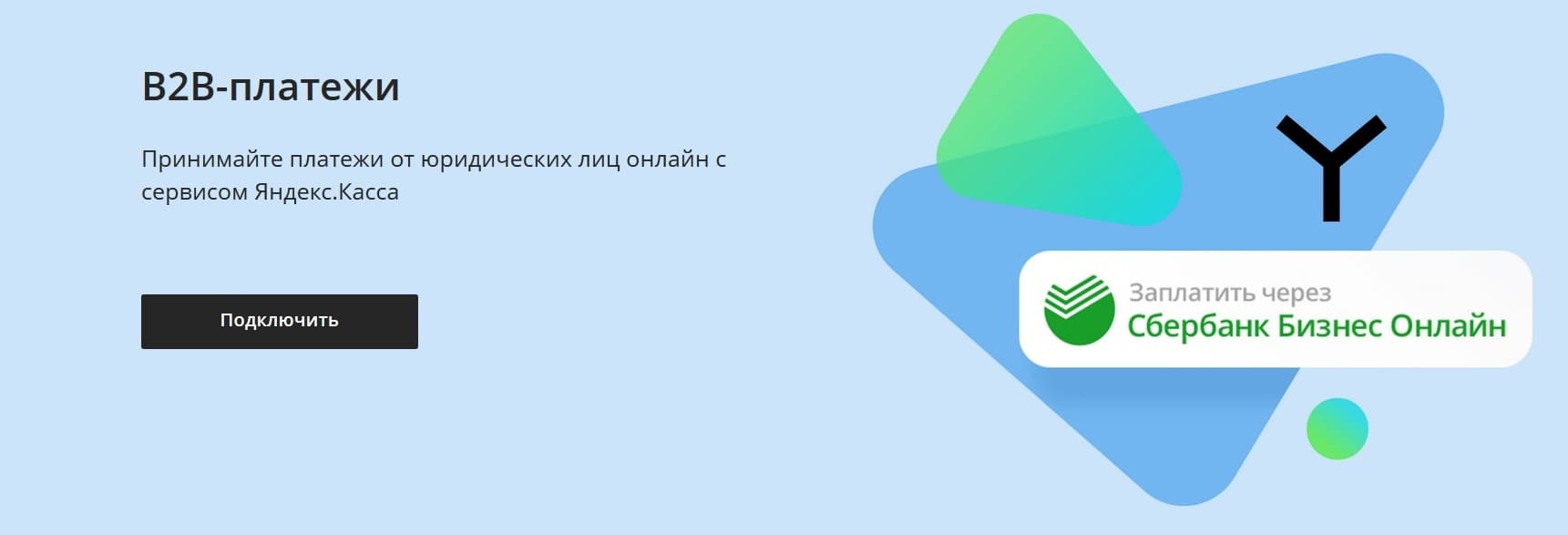 Подключить «B2B-платежи» можно через Яндекс.Кассу. С помощью сервиса продавцы смогут принимать онлайн-оплату от всех клиентов интернет-банка «Сбербанк Бизнес Онлайн», а это более 2,5 млн компаний.