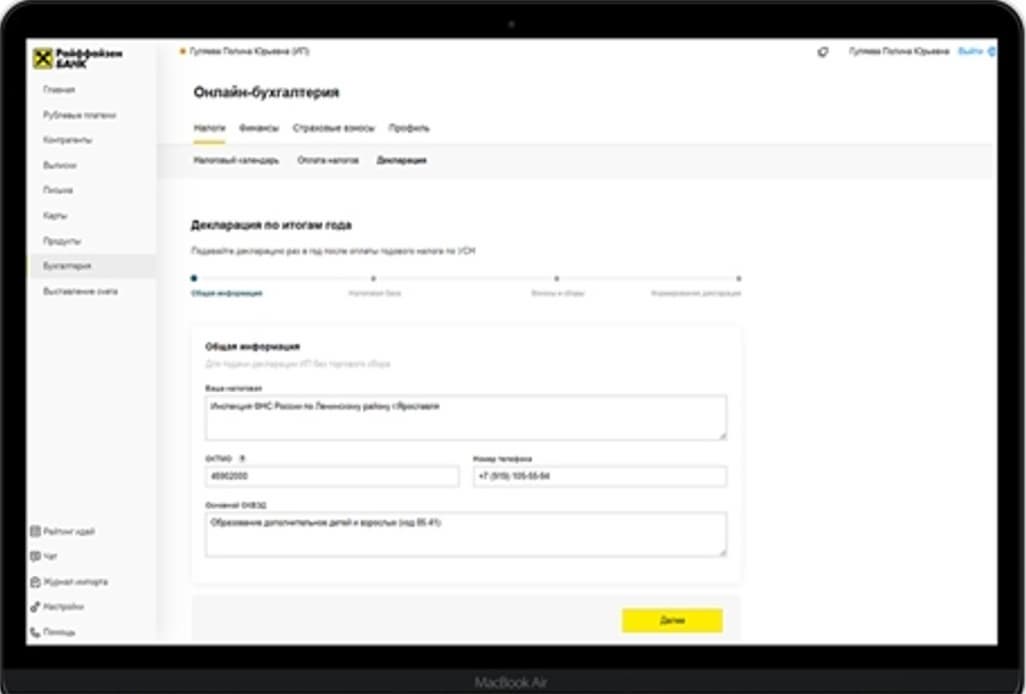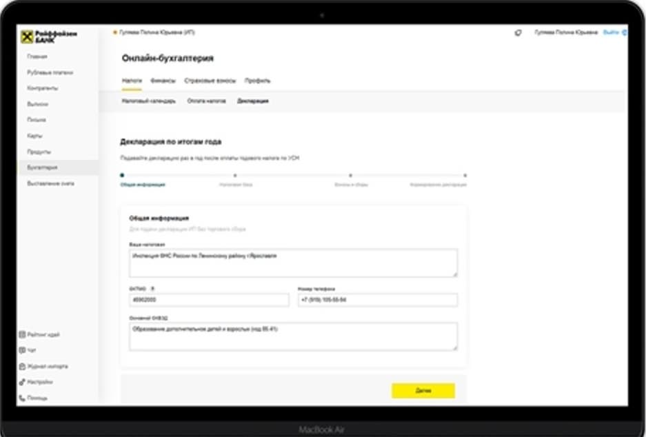 Чтобы сформировать декларацию, необходимо в разделе «Бухгалтерия» в интернет-банке для малого бизнеса перейти во вкладку «Налоги-Декларация»; проверить суммы дохода по каждому кварталу и указать уплаченные страховые взносы. Декларация будет рассчитана и сформирована автоматически и доступна для скачивания.