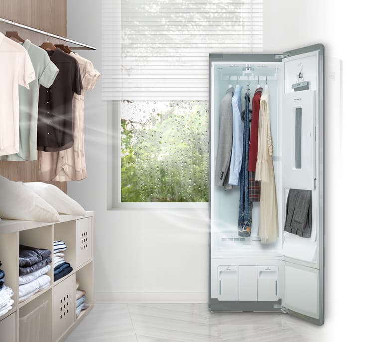 Так LG Styler c не просто ухаживает за одеждой, а удаляет при помощи пара до 99,9% бытовых аллергенов и бактерий, что особенно актуально сегодня. Большая семья может одновременно продезинфицировать до пяти вещей на вешалке, брюки и детский свитер или игрушку на полочке-это просто выход из положения.