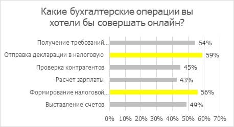 Более 40% опрошенных хотели бы автоматизировать свою бухгалтерию, а 25% уже это сделали. Самой востребованной онлайн-услугой предприниматели назвали формирование и отправку декларации в налоговую. Многие также хотели бы онлайн получать обратную связь от контролирующих органов.
